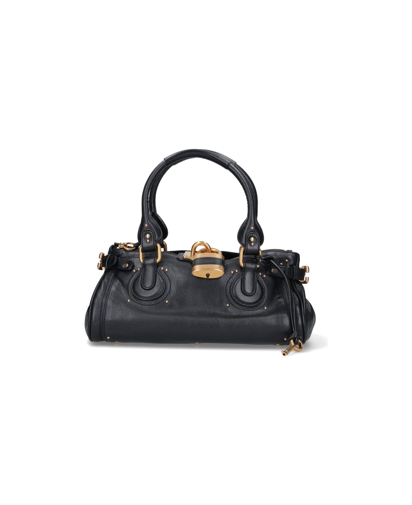 Chloé Paddington shoulder bag in black buffalo leather with two top handles, zip closure and gold padlock, leather logo on the padlock, key charm detail, adjustable gold metal buckles on the sides, all-over studs, flat front pocket, flat back pocket, inner zip pocket, main inner compartment.