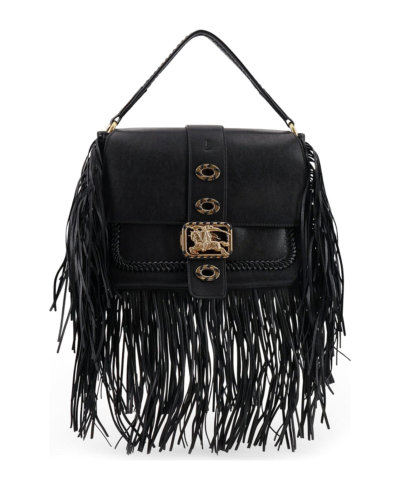 Leather handle Flap closure Metal logo buckle Removable and adjustable shoulder strap Oversized fringe detail Made in Italy W: 26 cm, H: 21 cm, D: 10 cm SKU: 8126286A1189