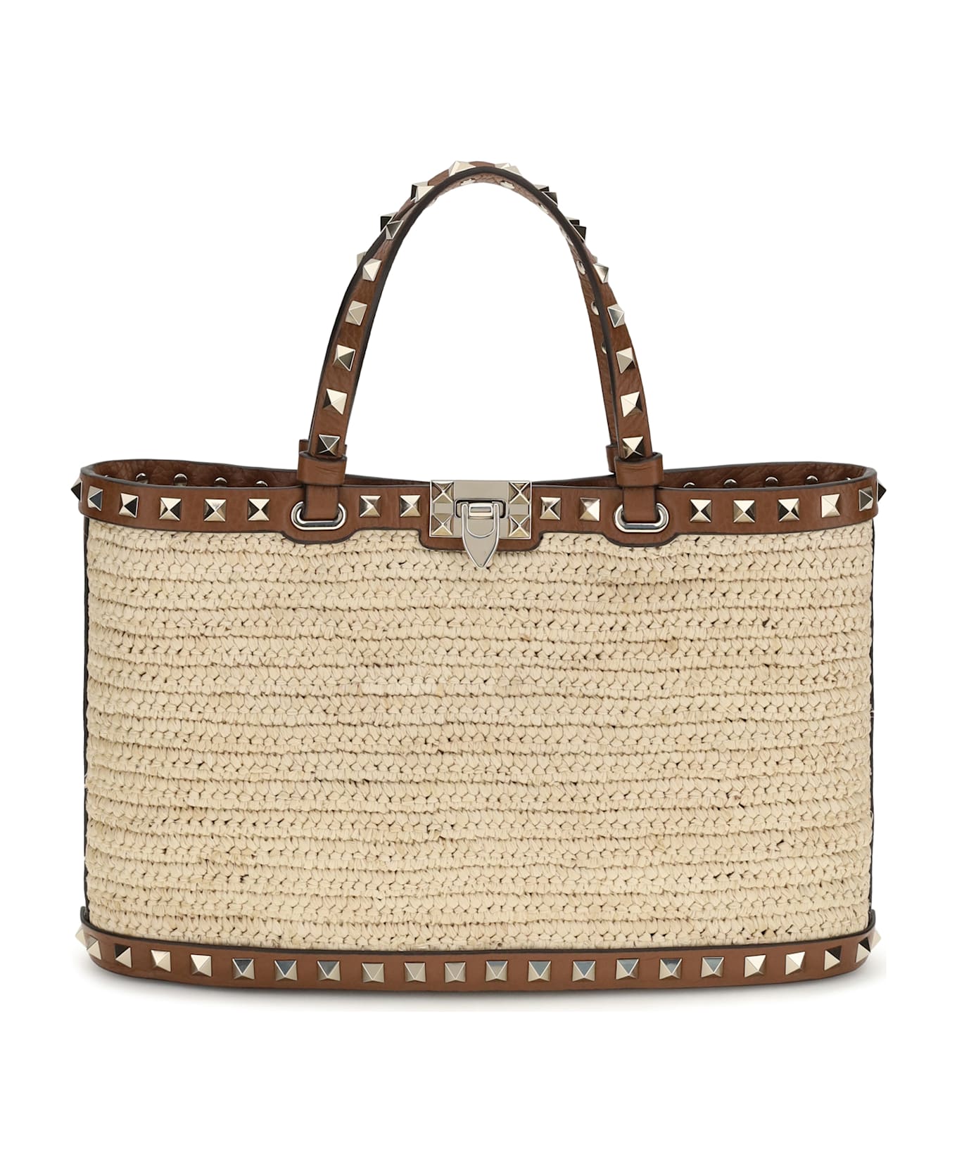 The rockstud raffia tote bag by valentino garavani is a mini tote bag in natural raffia embellished with leather trim and the iconic studs with platinum-finish hardware. featuring a hook closure, it can be carried by hand, over the shoulder, or crossbody thanks to the handles and removable chain, combining summery lightness with distinctive character. Composition: 100% % Raffia