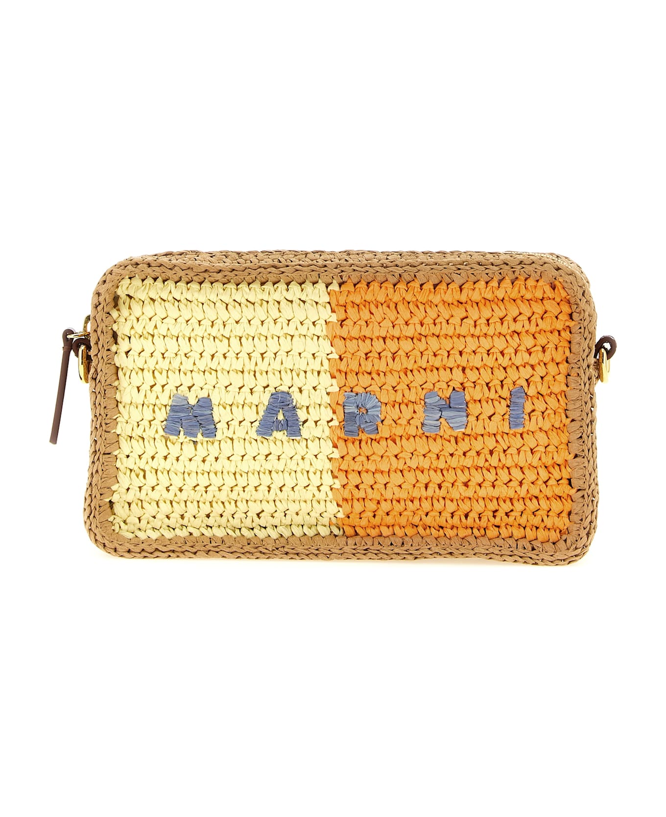Hand-woven raffia paper Seaside shoulder strap with contrast details, camera bag style, 'Marni' natural raffia logo embroidery on the front, top zip closure, cotton lining and inner pocket, adjustable and removable leather shoulder strap. Handcrafted product, any imperfections are to be considered characteristics of uniqueness.