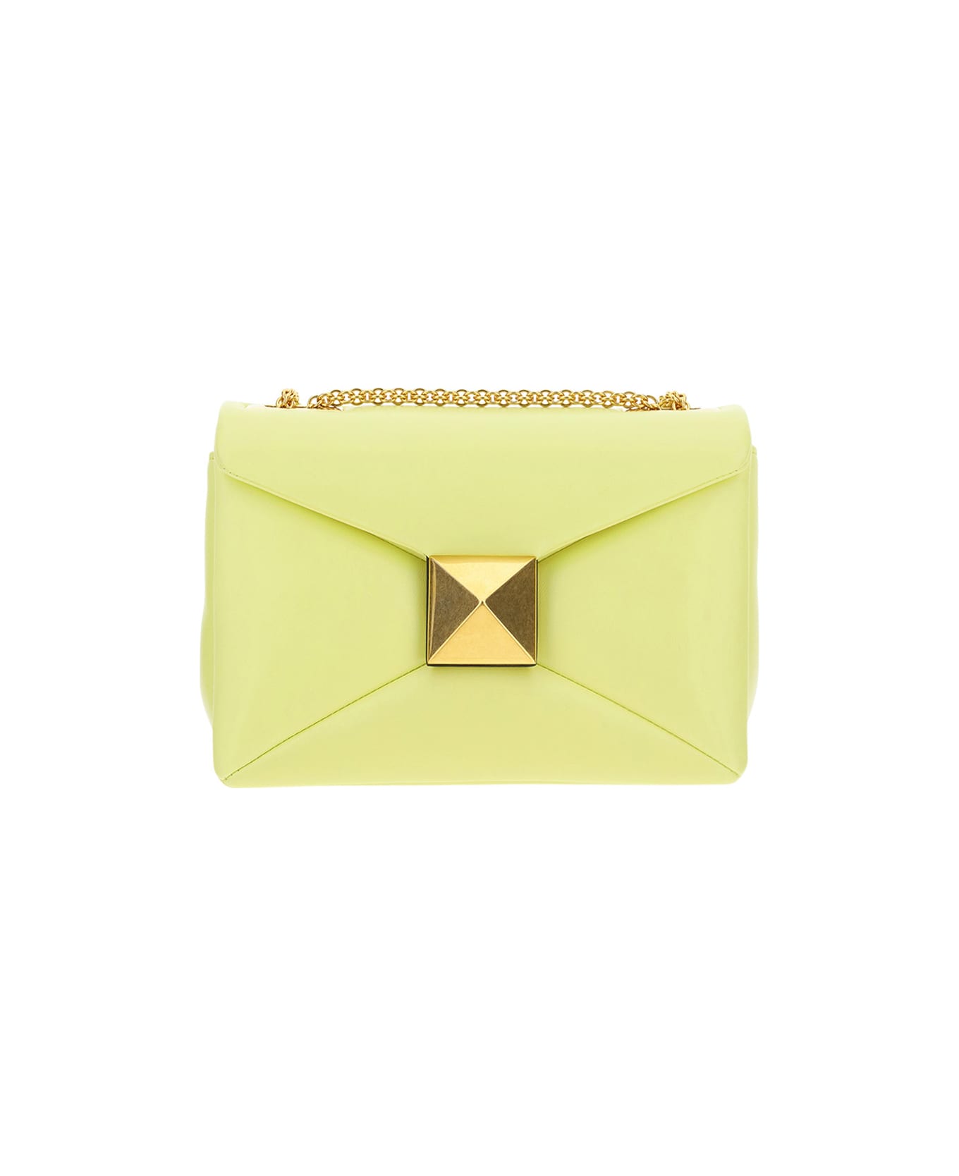 Lambskin shoulder bag by valentino garavani, magnetic button front opening, iconic antiqued brass maxi stud on front, double sliding chain shoulder strap, single interior compartment, front welt pocket, flat pocket inside, iconic brand signature contrasting press stud under front flap, quilted design on front. Composition: 100% % Lamb Ovis Aries Aries