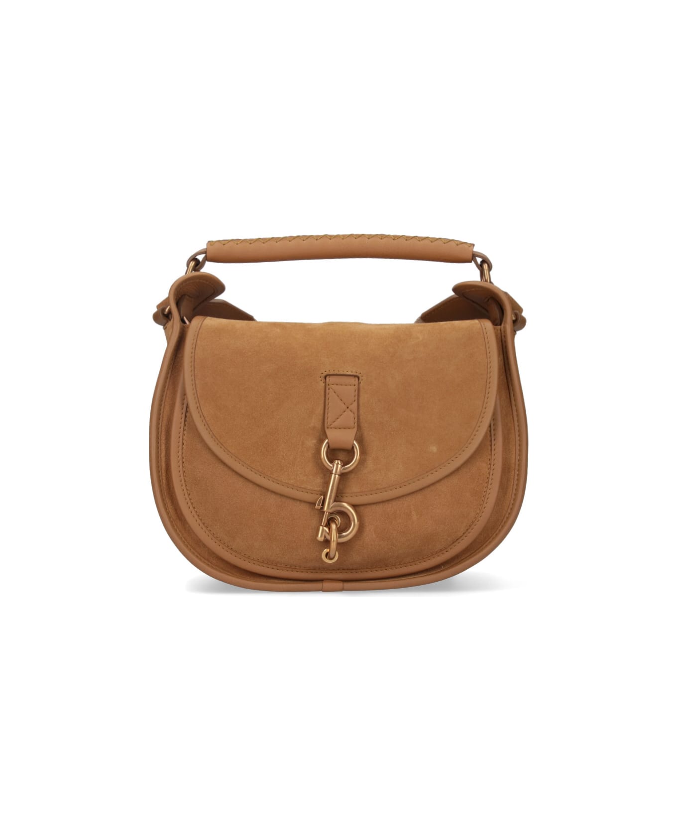 Burberry 'B Clip' small shoulder bag in brown suede with handle, adjustable and removable shoulder strap, iconic multicolour pattern detail, zip closure, maxi front pocket, hook flap closure detail, single inner compartment.