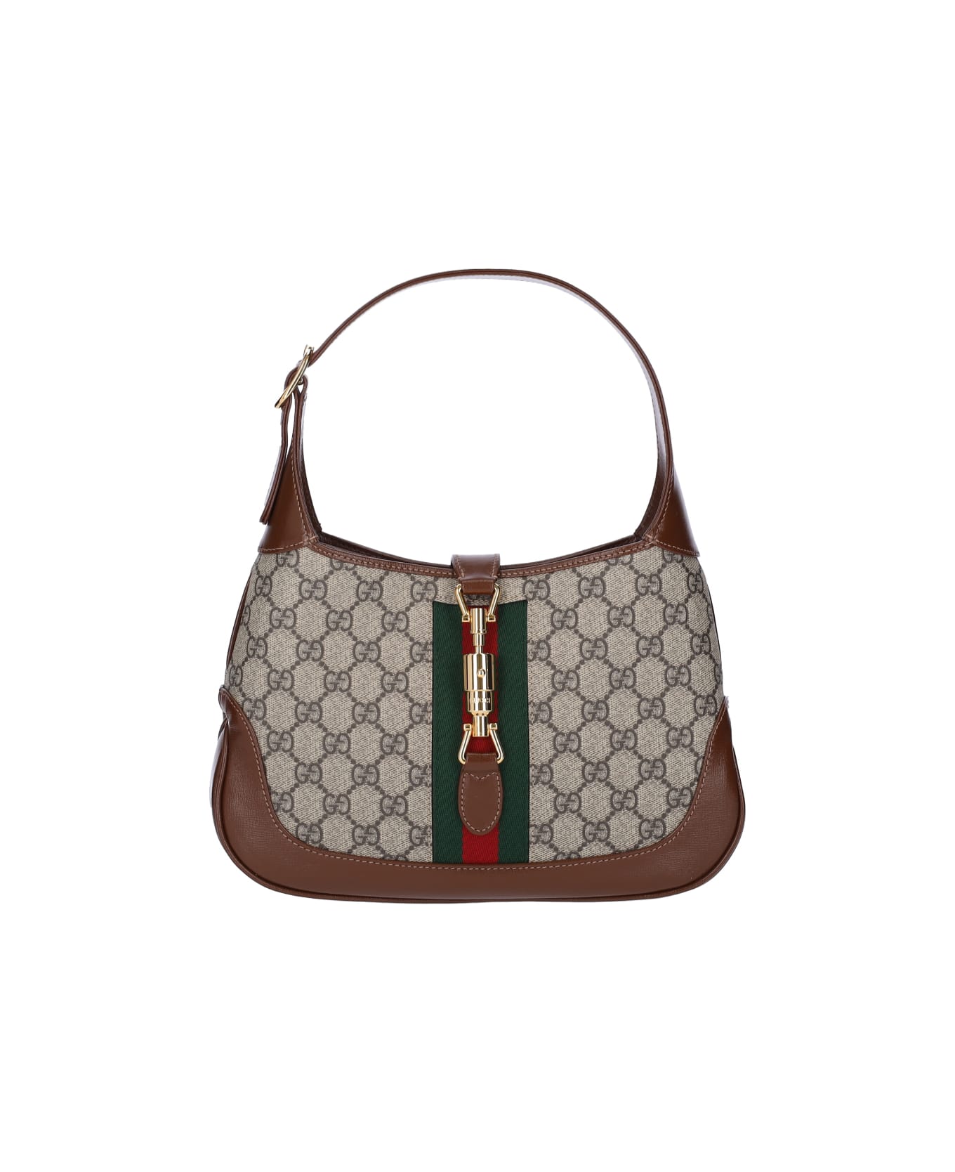 Gucci "Jackie 1961" small shoulder bag in beige "GG Supreme" fabric with brown leather details, green and red central web ribbon, extendable top handle, gold buckle detail closure, interior zip pocket, inner flat pocket, main inner compartment.