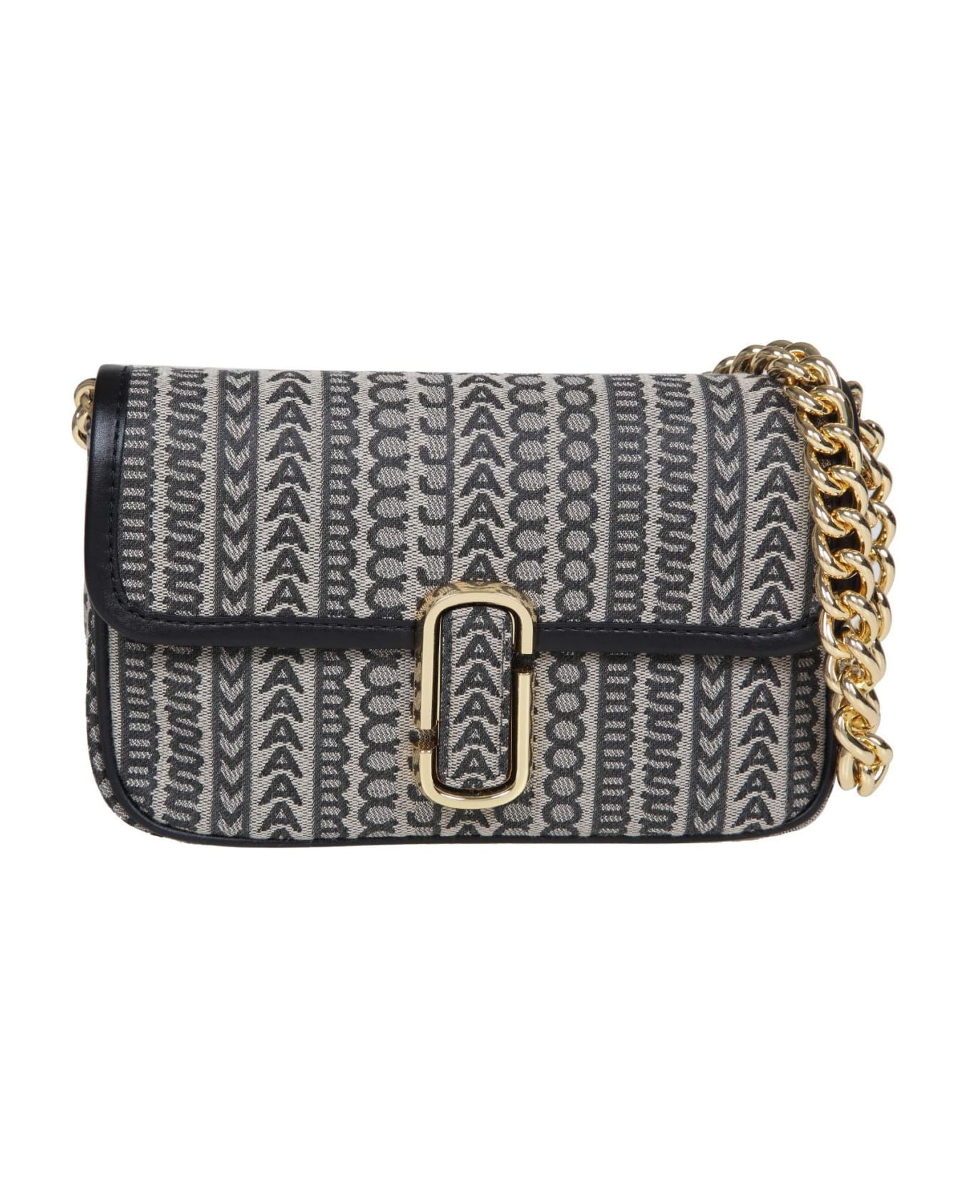 Fabric shoulder bag logo embroidered throughout the fabric color beige and black marc jacobs double j paper clip back slit pocket fabric interior internal slot pocket inside pocket with zip handle with removable chain removable and adjustable fabric shoulder strap flap and snap button closure shoulder strap length 68cm measures: width 24cm height 15cm depth 4. 5cm composition 100% fabric made in philippines