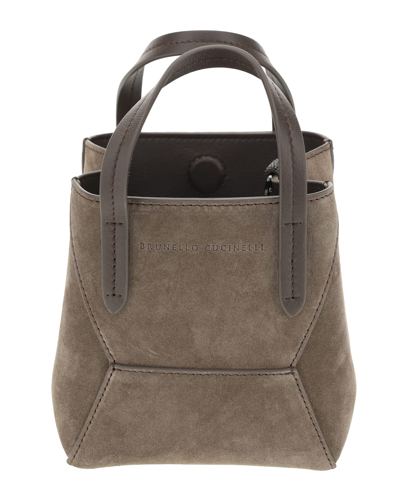 Brunello cucinelli's suede leather shoulder bag combines craftsmanship and sophistication. featuring two top handles and an adjustable and removable flat shoulder strap, it offers versatility and comfort. the paneled design enhances the elegant structure, while the iconic monogram on the front panel adds a distinctive touch. the interior magnetic button closure ensures practicality, and the iconic shiny jewels on the side panels lend brightness and sophistication. the single interior compartment ensures space and functionality, perfect for discreet and timeless elegance.