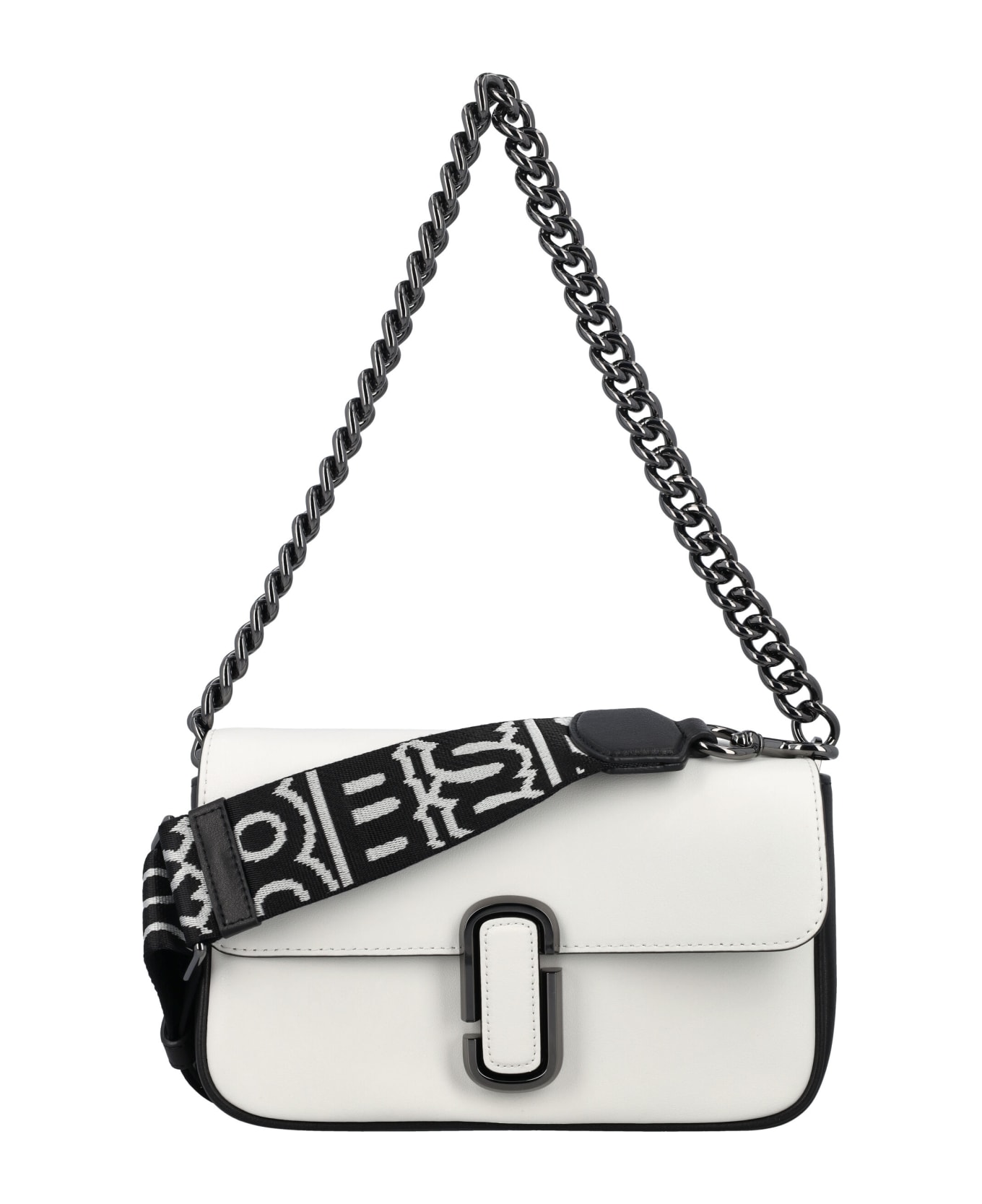 The Bi-color J Marc Shoulder Bag By Marc Jacobs. Featuring: Smooth Leather Magnetic Closure Removable Shoulder Chain Strap Removable And Adjustable Webbing Strap Interior Slip Pocket Interior Zip Pocket Back Slip Pocket With "marc Jacobs" Embroidery Faille Lining Height: 14,5cm Width: 23,5cm Depth: 4,5cm