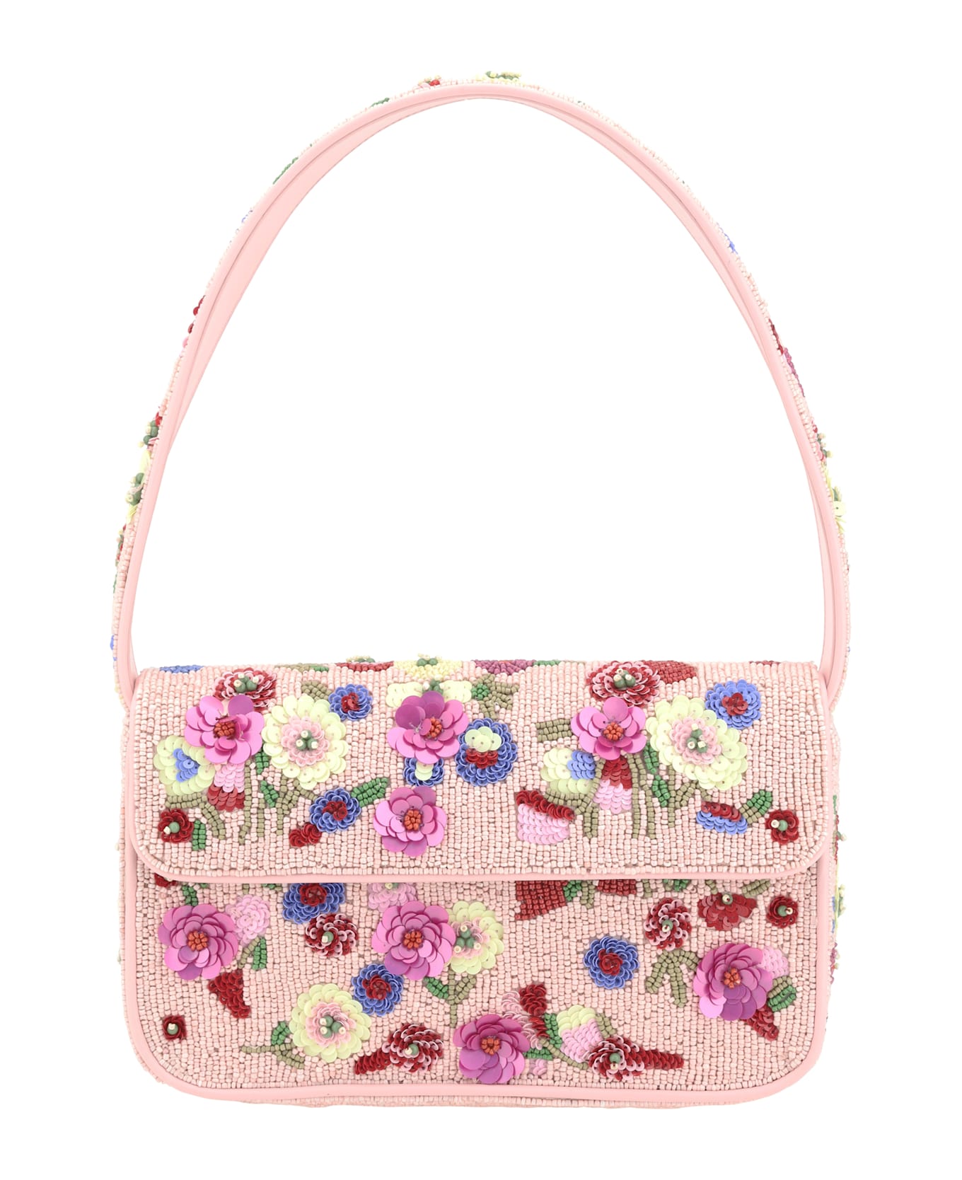 Tommy shoulder bag by staud features a flat top handle for convenient and practical carrying. the flap closure on the front ensures a clean and functional design. the surface of the bag is embellished with appliqué beads, creating a delicate and sophisticated floral decoration. inside, a single compartment provides enough space for essentials while keeping the aesthetic simple yet elegant. a perfect accessory to add a fresh and original touch to any look.