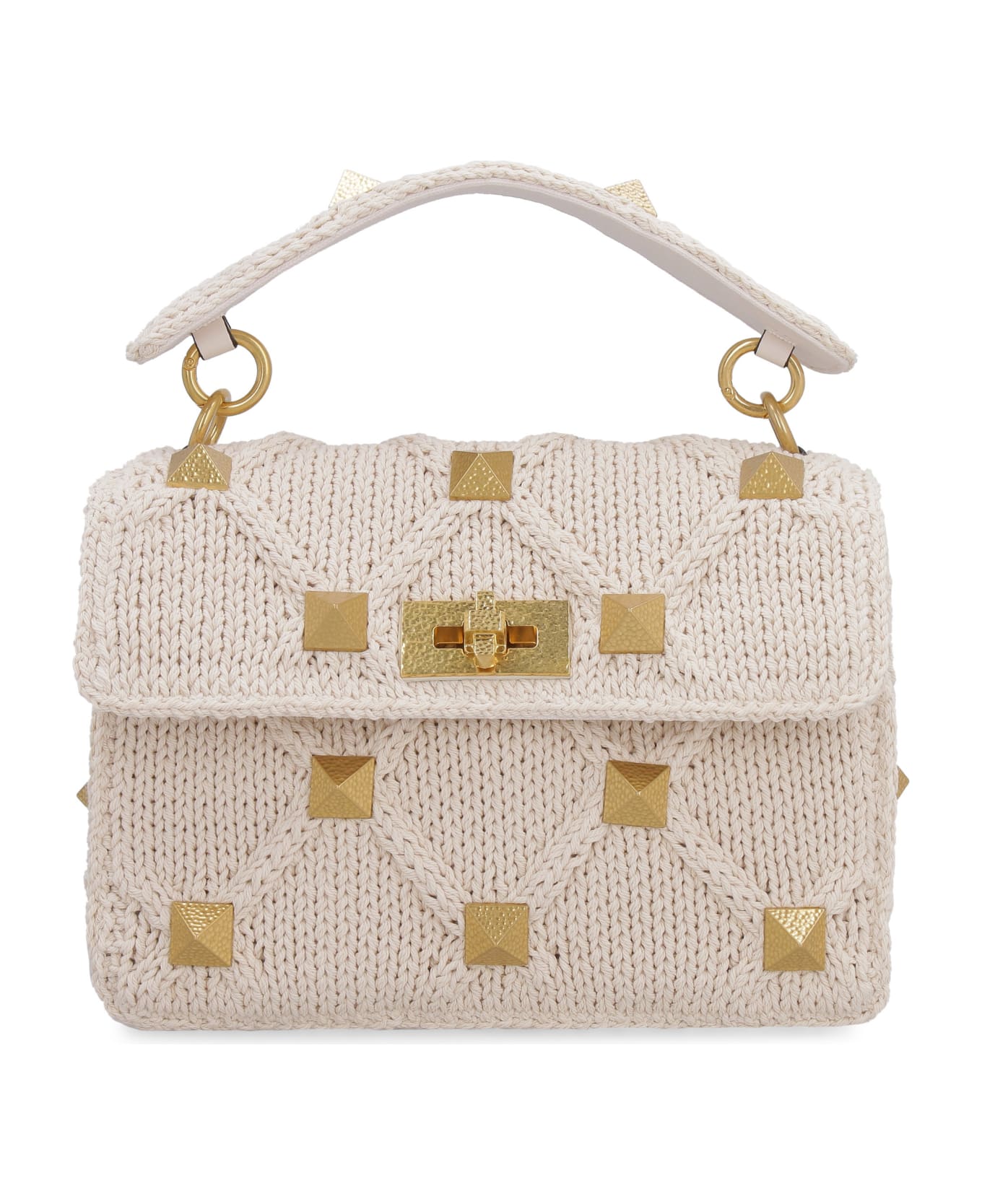 Decorative gold-tone metal studs Flap with turn lock closure Internal zip pocket Internal flat pocket Removable chain shoulder strap Gold-tone metal hardware Fabric lining Width: 24 cm Height: 16 cm Depth: 7 cm Shoulder strap: 130 cm 100% Cotton