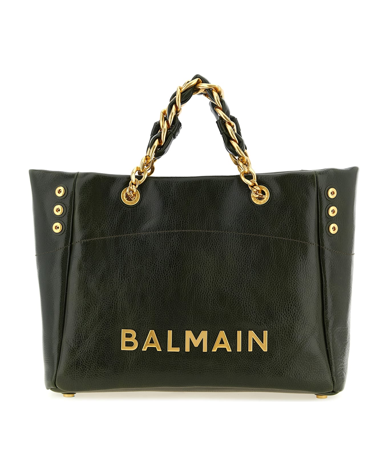 Large '1945 Soft' hammered leather shopping bag with front metal lettering logo, double leather handle woven to the chain, double long leather and chain handle, inner magnetic closure, side snap buttons to change the capacity of the bag, rigid base with metal feet.