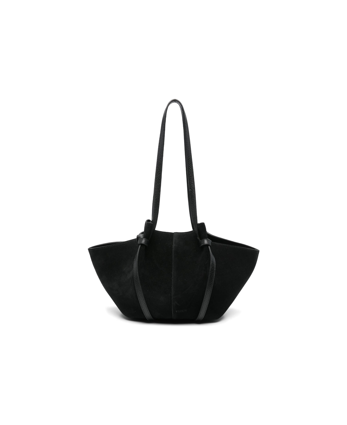 black suede panelled design magnetic fastening two adjustable shoulder straps expandable sides main compartment This piece comes complete with a protective dust bag.