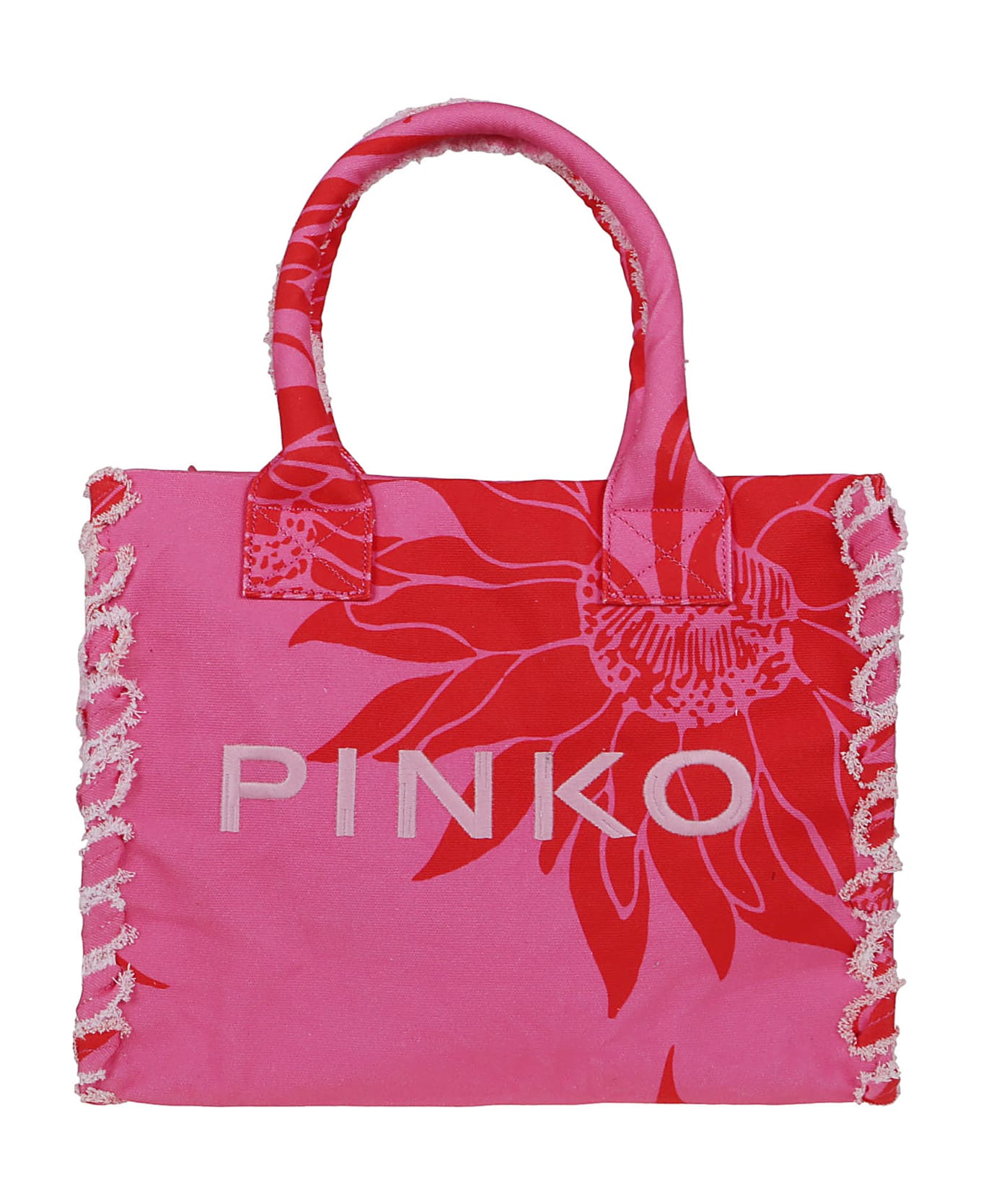 Beach BY PINKO shopper bag. Square shape in recycled cotton canvas; lined in lightweight recycled cotton fabric; double handle top handle. Embroidered logo detail and side threads with a fringed effect.