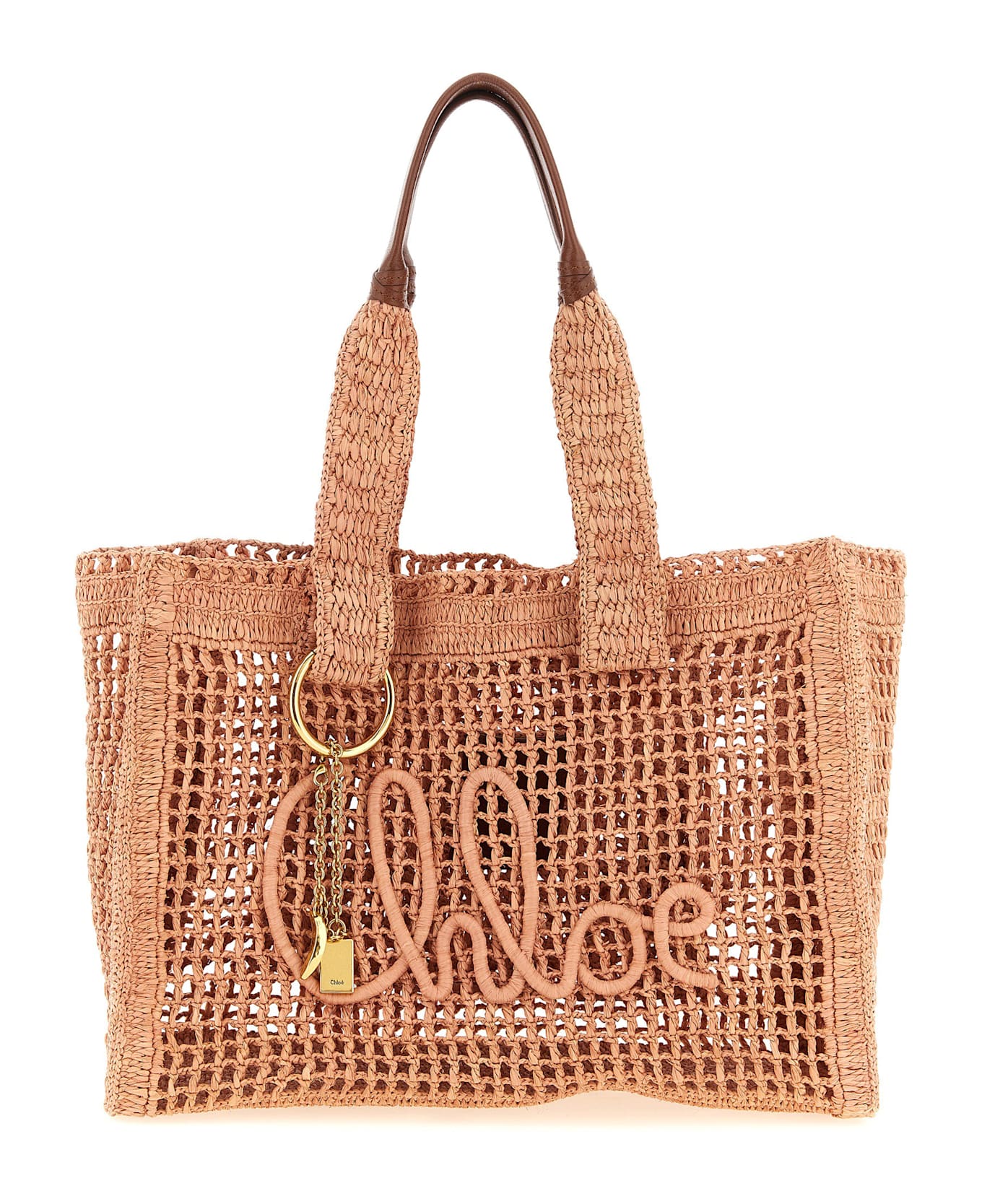 Handcrafted East-West Summer Banana crocheted raffia shopper bag with Chloé embroidery in tone-on-tone italics on the front, double fixed handle with buffalo leather top and metal charm decoration. Handcrafted product, any imperfections are to be considered characteristics of uniqueness. SUSTAINABLE: To make this product, Chloé worked with tanneries with Leather Working Group (LWG) certification, which is based on water and energy consumption and chemical, solid waste and slurry management policy. Made For A Woman is a social enterprise based in Madagascar that aims to support the most vulnerable women through adequate wages and help them build a better life with their family.