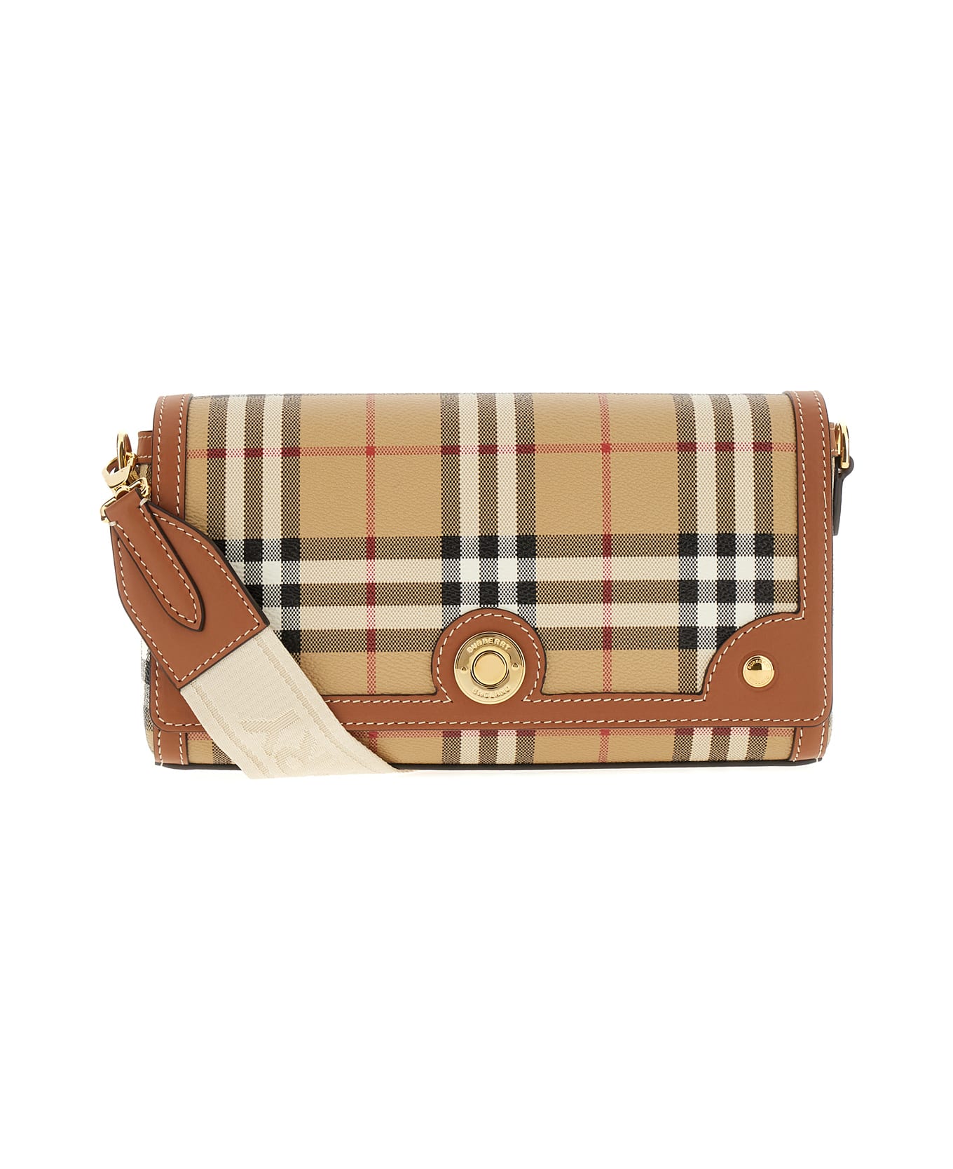 Crossbody bag realized in coated fabric with leather inserts on the trimmings characterized by Burberry Check motif print on the entire surface. -Detachable leather handle -Adjustable detachable logoed fabric shoulder strap -Magnetic button closure -Lined Composition: Exterior: 100% Fabric 100% Leather Lining: 100% Cotton Finishing: Golden metal