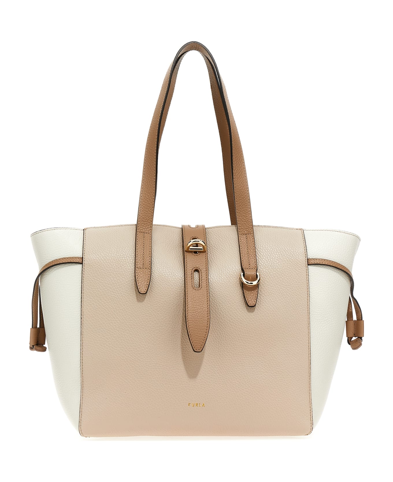 Furla Net M' grainy leather shoulder bag with long handles, lacing turn-up closure, oval hole details on the front, front lettering logo, side drawstring, D ring on the side for charms and small cases, an inner zip pocket.