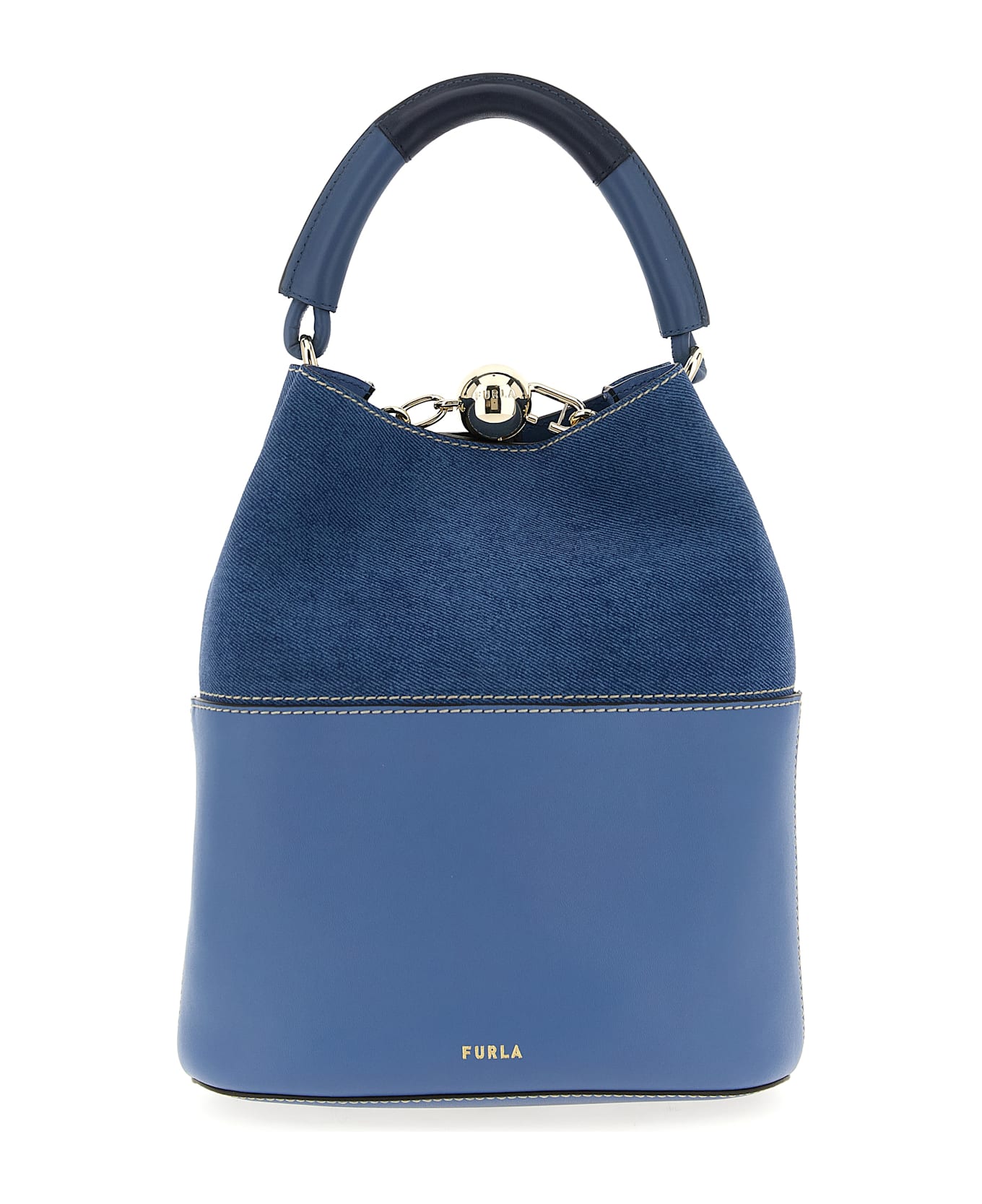 'Furla Sfera S' bucket bag in smooth leather and printed suede with denim effect, contrast stitching, front embossed logo, fixed handle, magnetic closure, inner metal strap with interlocking ball hardware, clutch bag, adjustable and removable shoulder strap.