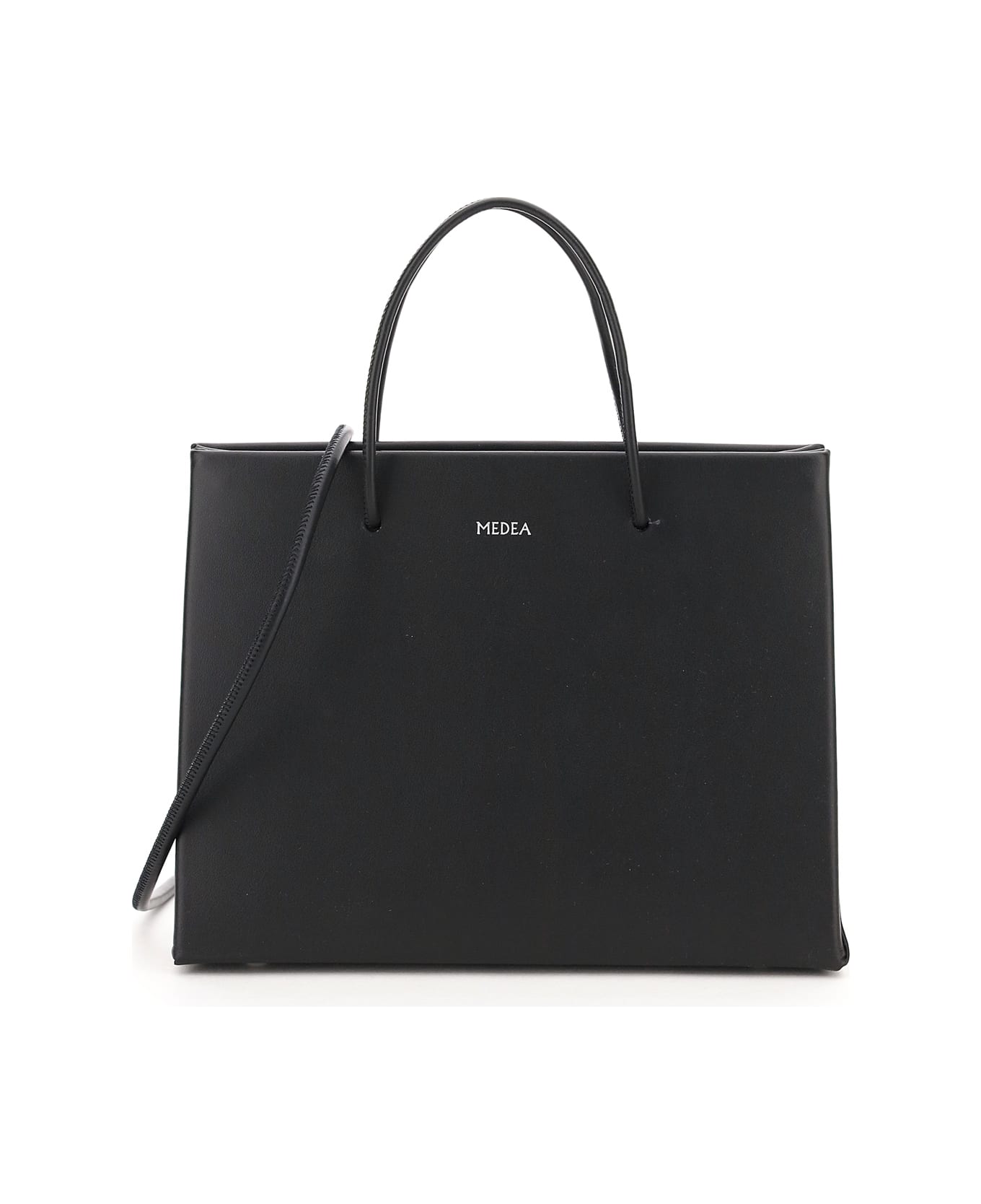 Hanna bag by Medea crafted in calf leather with rigid construction and sliding tubular handles. Removable and adjustable shoulder strap, silver-tone logo print on front, magnetic closure on the sides and cotton lining. Silver-finished metalware and protective studs.