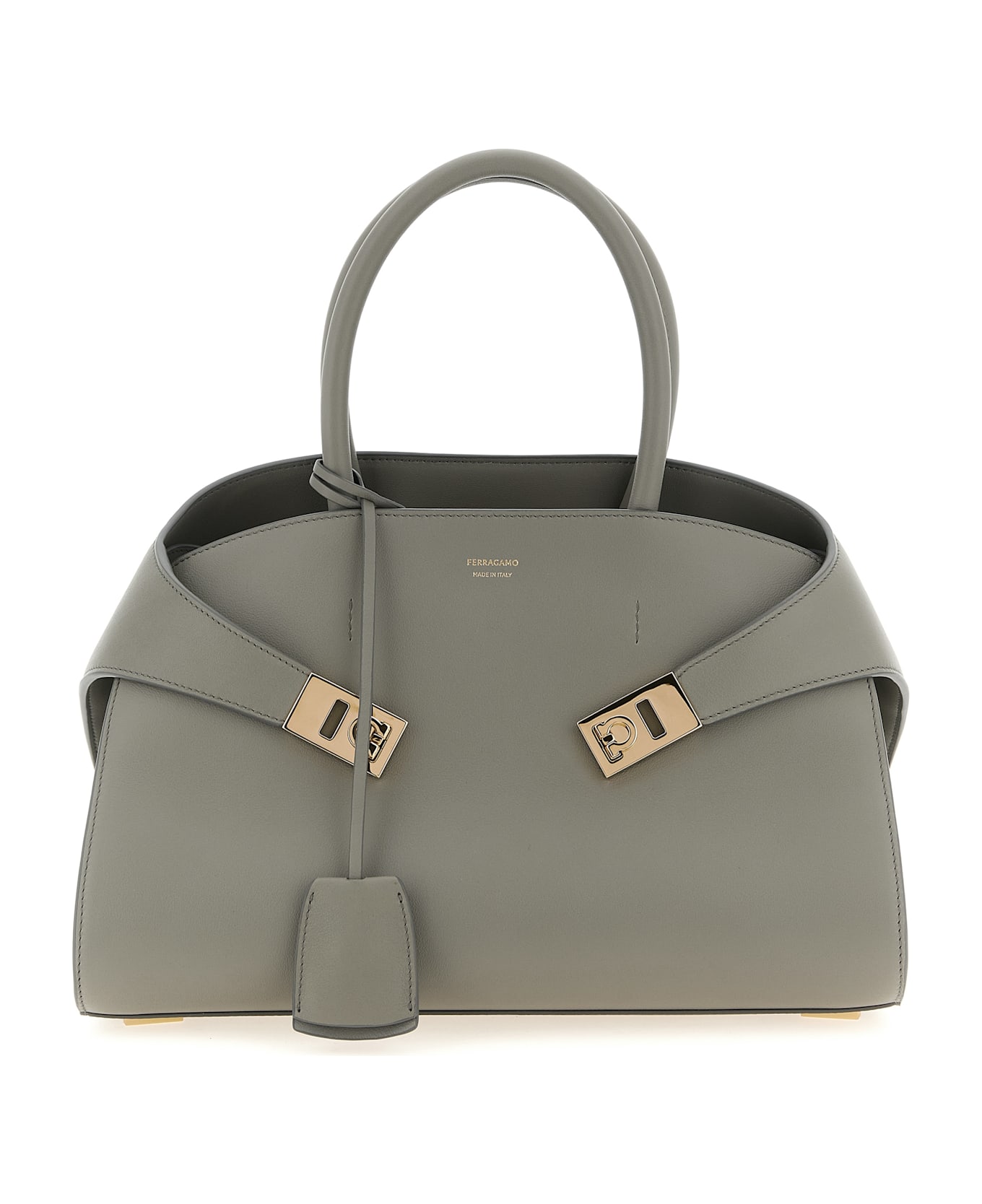'Hug (M)' handbag in calf leather treated with vegetable anilines, front embossed logo, side gussets with metal 'Gancini' decoration, inner bitter closure, double fixed tubular handle, rigid base with metal feet, adjustable and removable shoulder strap, removable keyring.