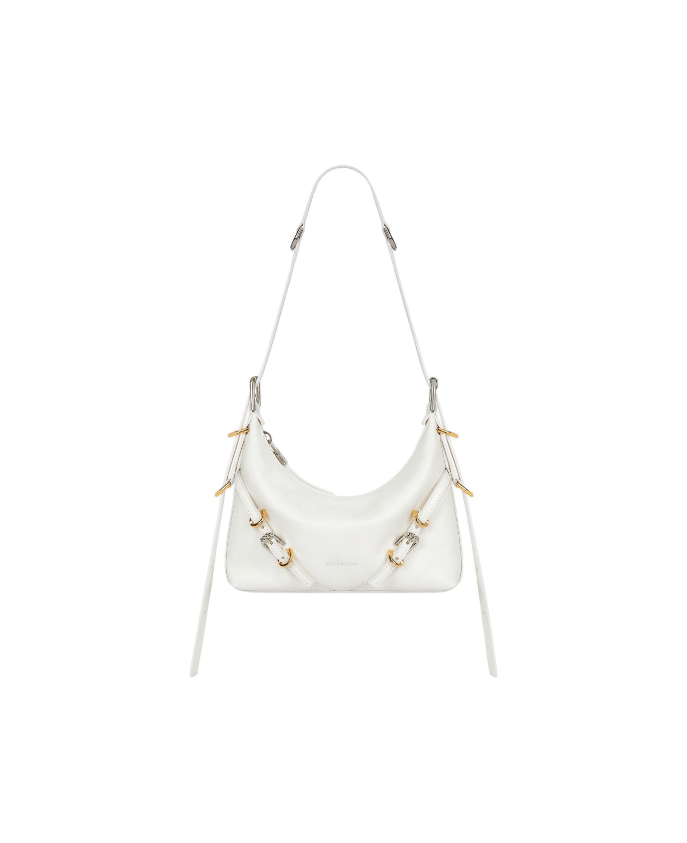 Ivory Voyou mini shoulder bag crafted from lightly tumbled calf leather. Model featuring a main compartment, an internal zipped pocket, top zip closure, gold and silver-tone metal details, metal buckles with GIVENCHY engraving, adjustable shoulder strap for hand, shoulder or cross-body wearability (length from 30 to 95. 5 cm). Minimum span: 20. 5 cm and maximum span: 50 cm. The bag is finished with the signature GIVENCHY embossed on the front of the bag and on the back of the shoulder strap.