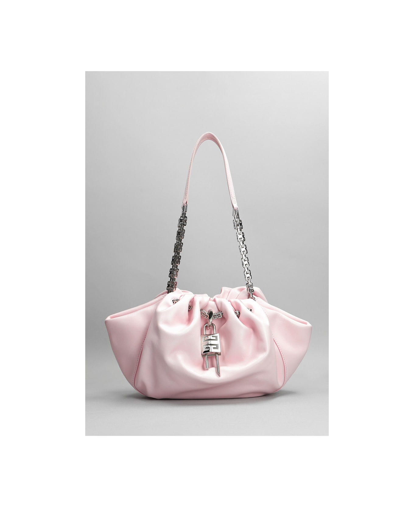 Kenny Shoulder bag in rose-pink leather, chain and leather carry, lock metal detail, silver hardware, coulisse closure, 100% leather, Made in Italy, Height 160 mm, Width 320 mm