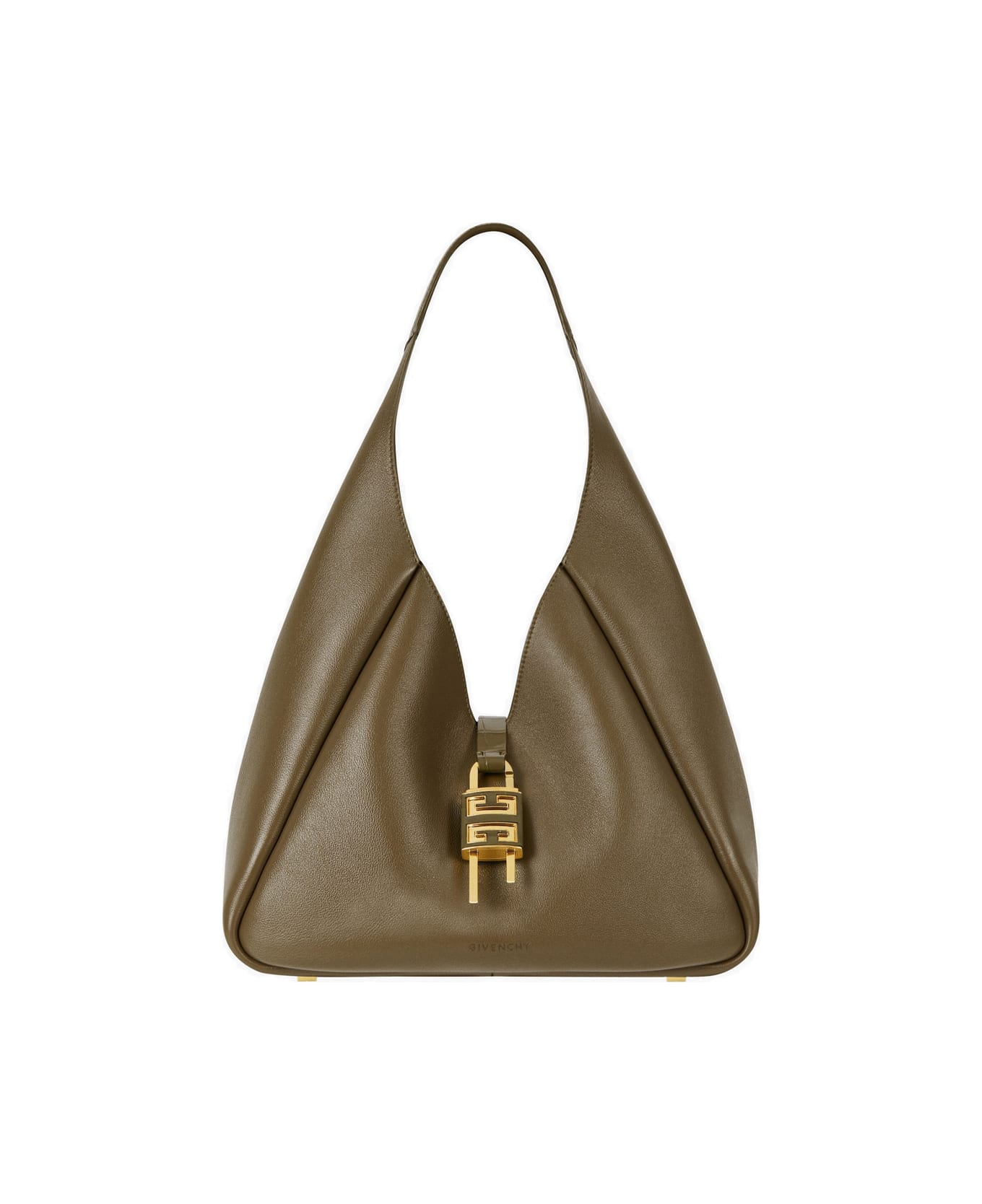 Medium G-Hobo shoulder bag by GIVENCHY made of soft khaki calf leather and featuring suede lining, gold-tone metal details, single internal compartment, crocodile-embossed leather handle, metal feet with 4G motif and closure with crocodile-embossed leather band and removable metal and leather 4G padlock.