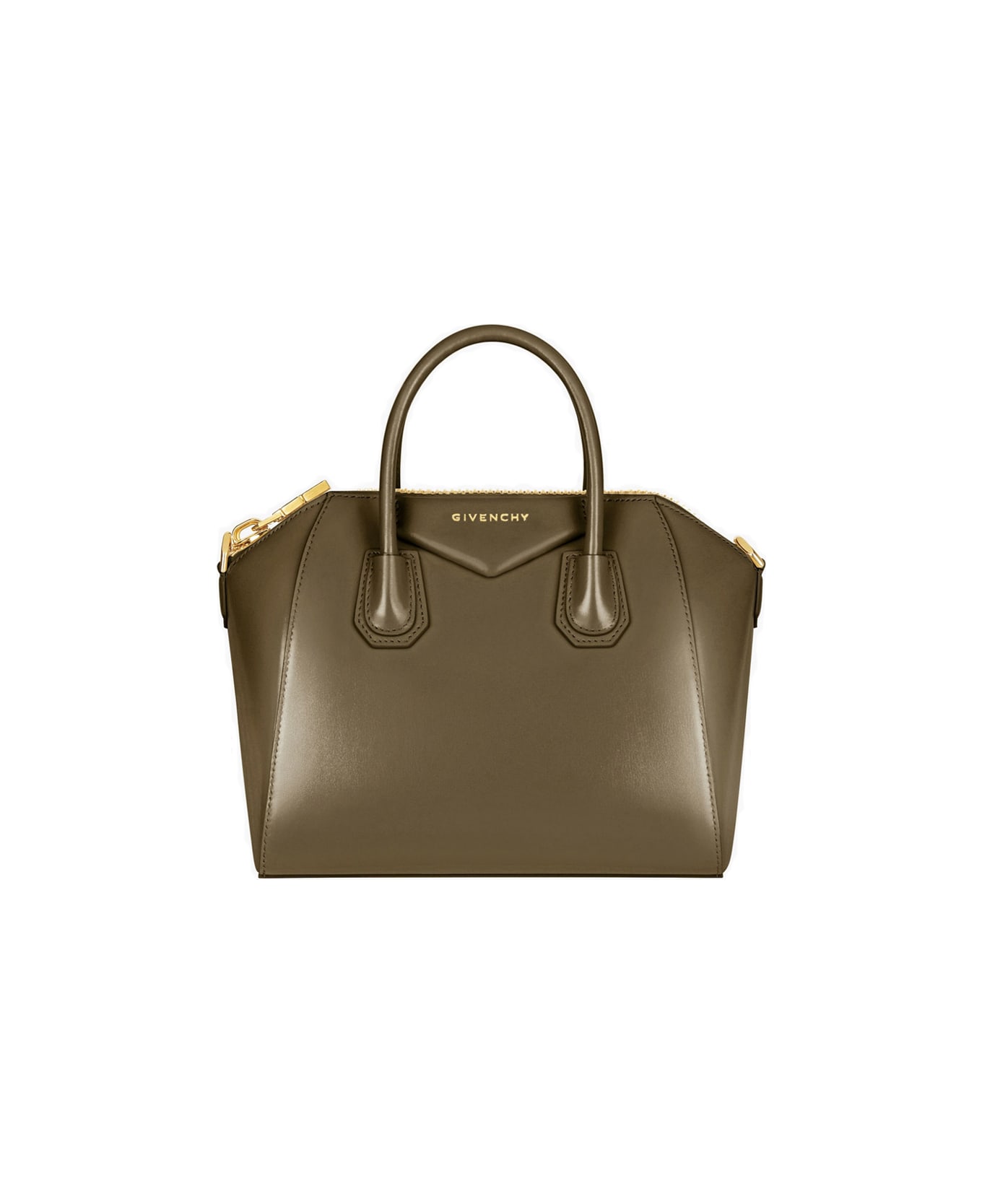 Small Antigona bag by GIVENCHY crafted in khaki Box leather and featuring two top handles, single internal compartment with pockets, gold-tone metal hardware, removable and adjustable leather shoulder strap, top zip closure and GIVENCHY 4G zip puller. Bag finished with the iconic pentagonal leather appliqué with gold-tone GIVENCHY signature stamped on it.
