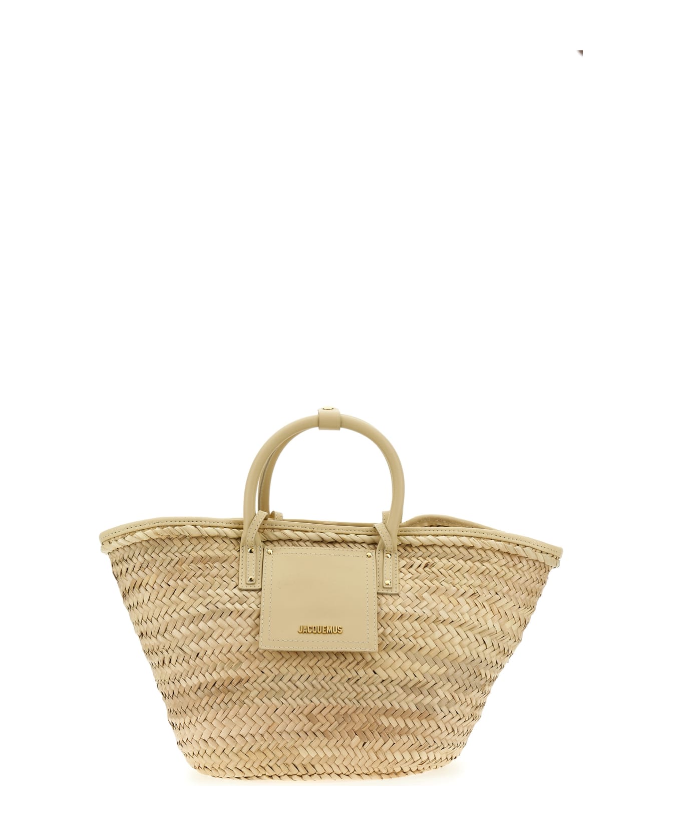 'Le Panier Soli' raffia shopping bag with leather details, double short leather handle, double long leather handle, front leather pocket with metal logo appliqué Composition: