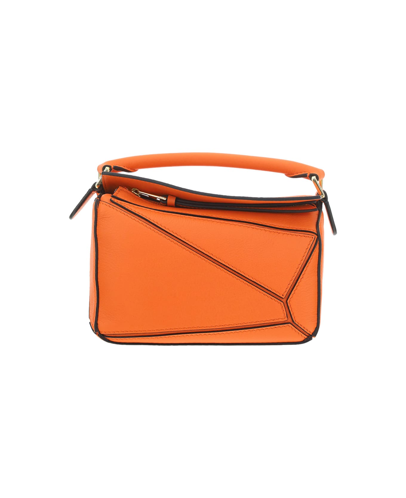 Mini puzzle leather handbag by loewe, top leather handle, geometric details, zippered closure, removable and adjustable shoulder strap, embossed front logo.