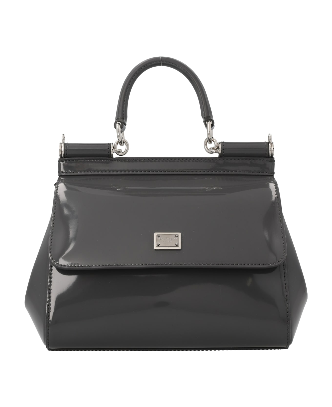 Shiny leather handbag with front logo plaque, small top handle, a magnetic closure, awith adjustable and removable shoulder strap. Composition: