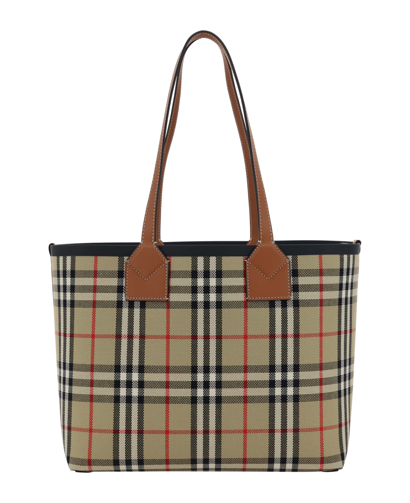 Cotton london tote bag by burberry, double flat leather top handle, a design with the brand's iconic all-over printed archival check pattern, contrasting leather details and trim, a matching and removable internal mini pouch and a single internal compartment.