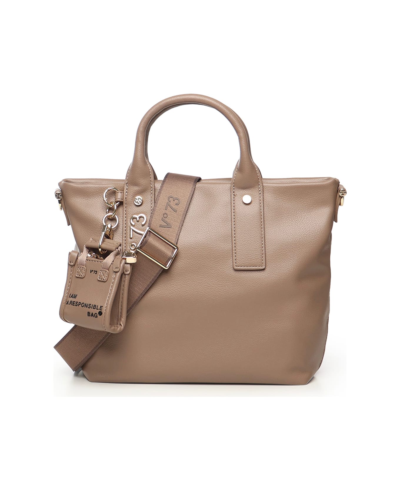 - Made from recycled nappa leather - Top handles - Adjustable and removable shoulder strap - Logo details - Removable charm - Dimensions: 25. 5 x 25 x 10. 5 cm - Color: Taupe