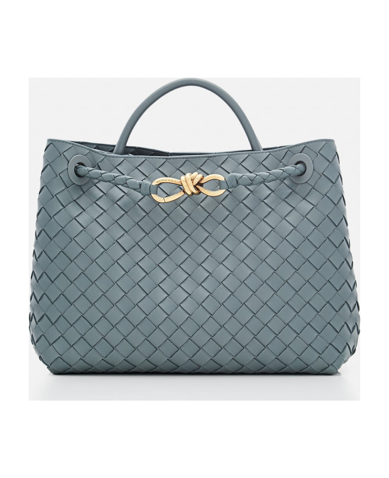 Andiamo Medium tote bag is topped with knotted golden hardware. Leather lining. Leather shoulder strap, top handle. Color: grey.