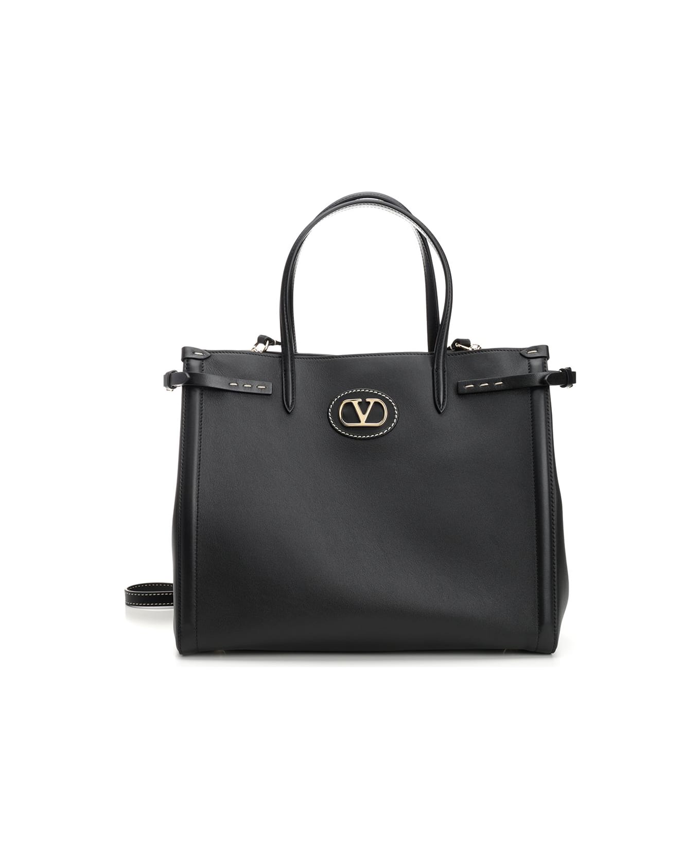 Medium "Antibes" shopping bag in black leather by Valentino Garavani. Leather patch on the front with contrasting stitching and gold-finish VLogo metal element. Adjustable side buckles. Two handles and adjustable and removable shoulder strap. Magnetic closure and protective feet. Composition: VT100%