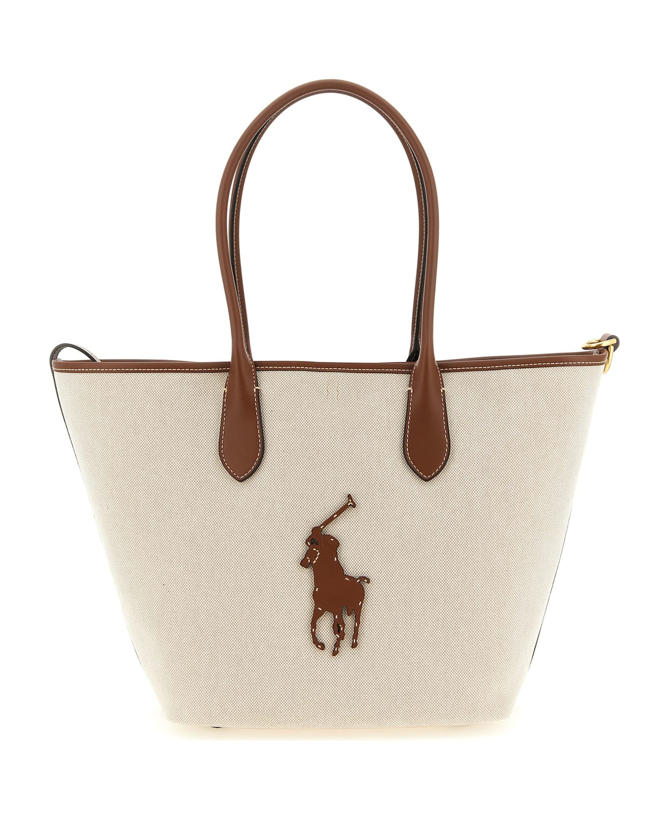 Medium shopping bag in cotton canvas canvas with contrasting smooth leather details, maxi front logo patch, double fixed handle, internal carabiner closure, side strap to change its width, base with leather feet.