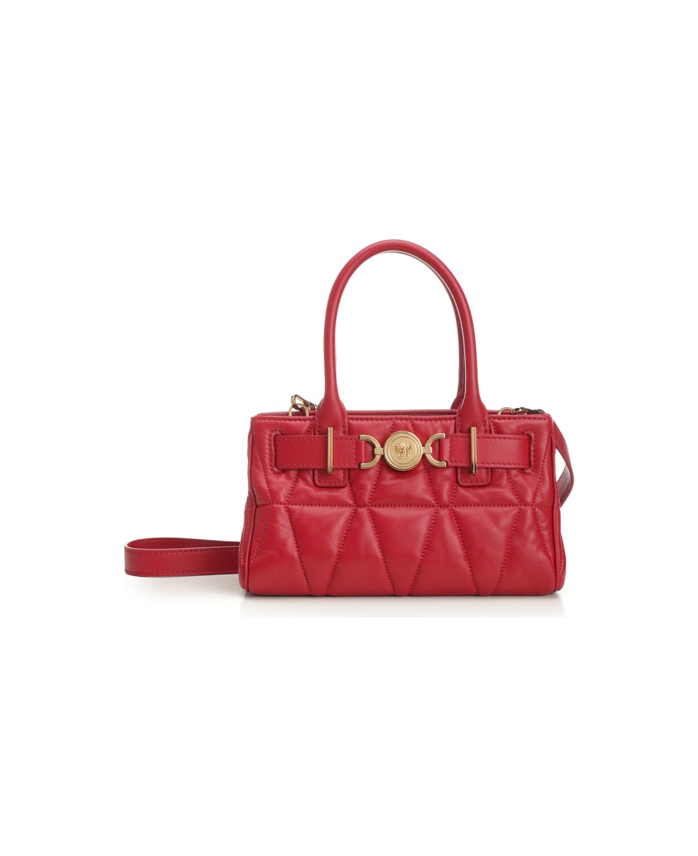 Handbag with hardware "Medusa '95" by Versace characterized by a horizontal shape, made of soft nappa with a quilted "V" motif, also wearable on the shoulder thanks to the adjustable and removable shoulder strap. Equipped with a double top handle, a main compartment with a flat pocket, and metal feet.
