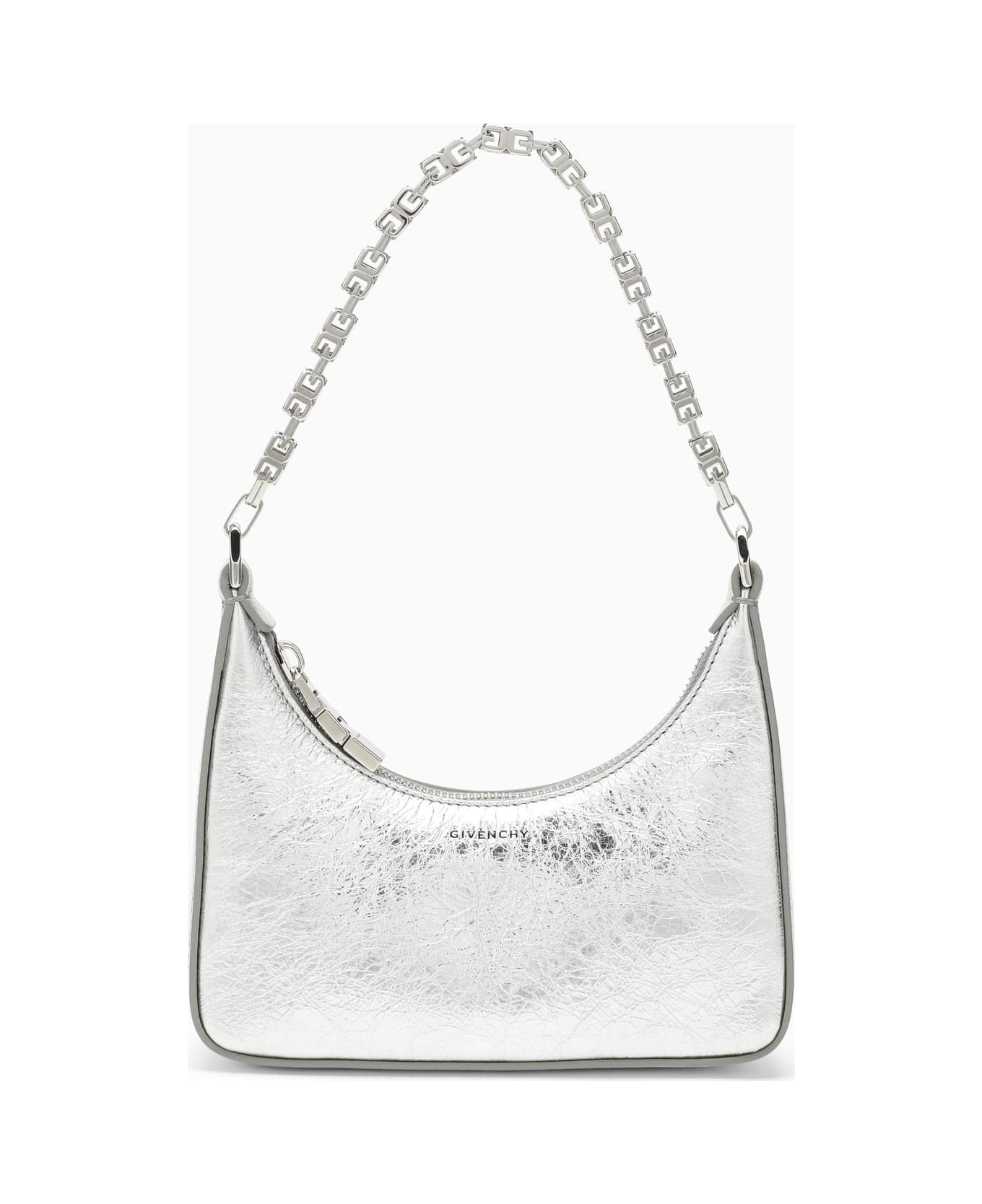 Silver metallic leather mini bag from Givenchy featuring a top zip fastening, a detachable G Cube chain handle, an adjustable and removable shoulder strap and silver-tone metal hardware. Composition: Fabric I: 100% Calf leather / Lining: 51% Polyurethane - 49% Cotton