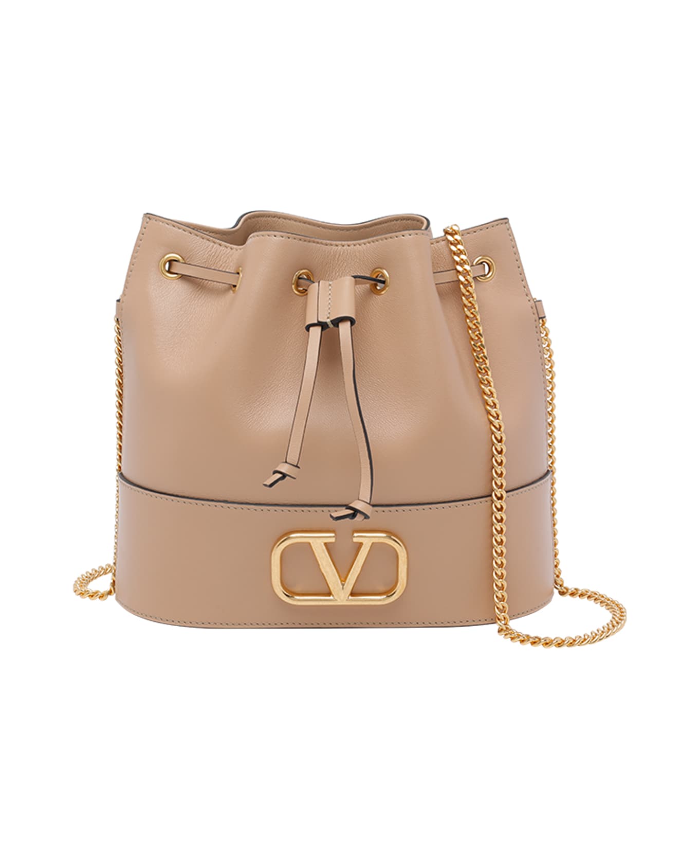 Valentino Garavani sand Vlog Signature chain bucket bag with coulisse closure, fixed chain shoulder strap Composition: 100% Calf Leather