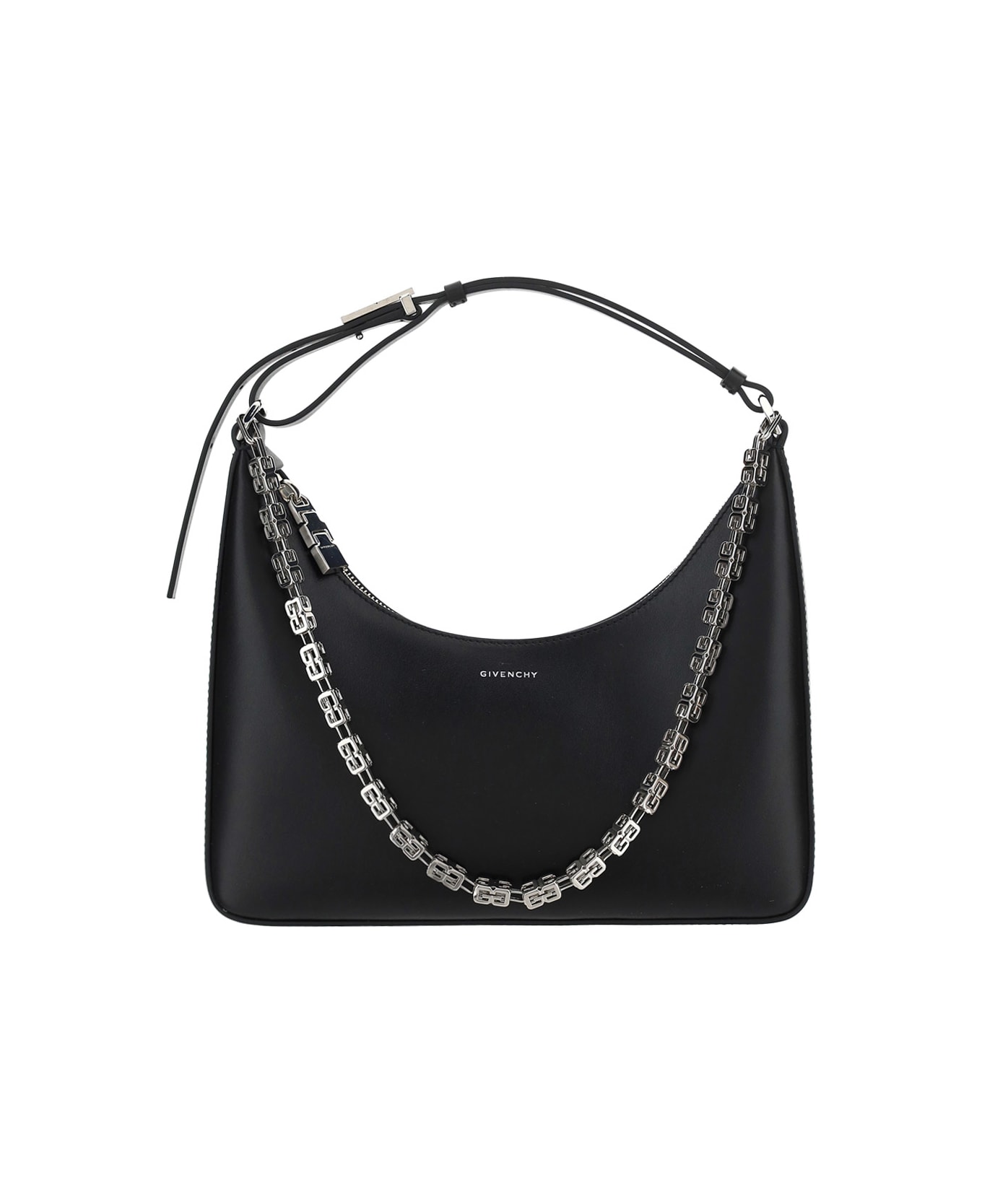 Calfskin moon cut small bag by givenchy, shoulder strap with iconic removable g cube, adjustable upper handle, zip closure, contrasting logo on the front, internal zip pocket.