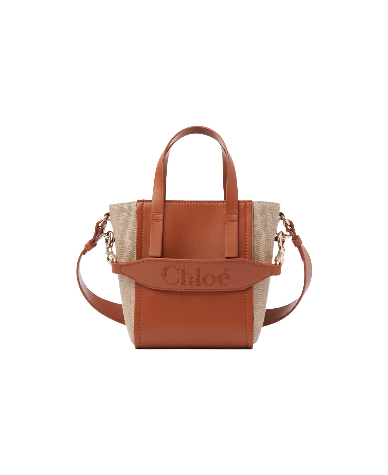 "Sense" bag by Chloé made of natural linen and Caramel-coloured leather. Model featuring two handles, single internal compartment, removable shoulder strap and handle with iconic embroidered Chloé logo in tone. Metallic details with gold finish. The bag can be carried by hand, over the shoulder or cross-body. Supplied with dust bag.