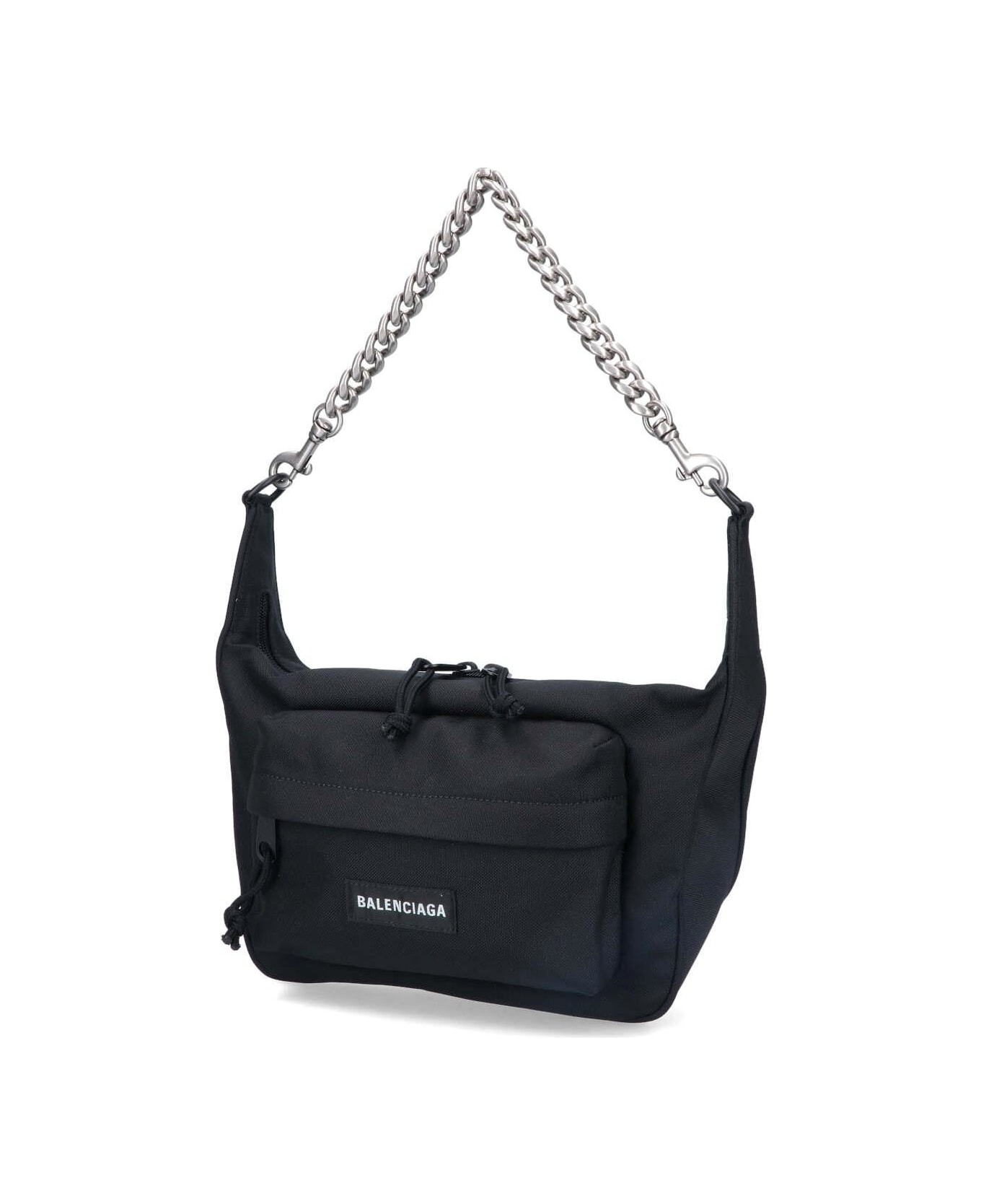 Balenciaga 'Raver' black midi shoulder bag in recycled nylon with double zip closure, removable silver chain handle, front zip pocket, white logo lettering at the front, back zip pocket, main inner compartment.