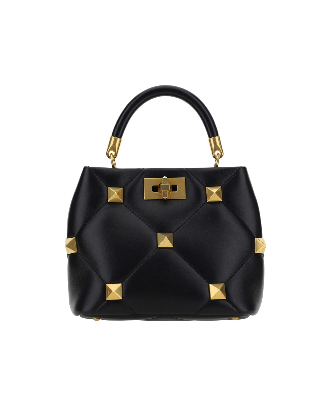 Lambskin roman stud hand bag by valentino garavani, double compartment, exterior hook-and-eye closure and interior magnetic button closure, rigid hand handle, sliding adjustable golden shoulder strap and removable stud-decorated leather handle, diamond pattern embellished with antiqued brass studs. Composition: 100% % Lamb Ovis Aries Aries