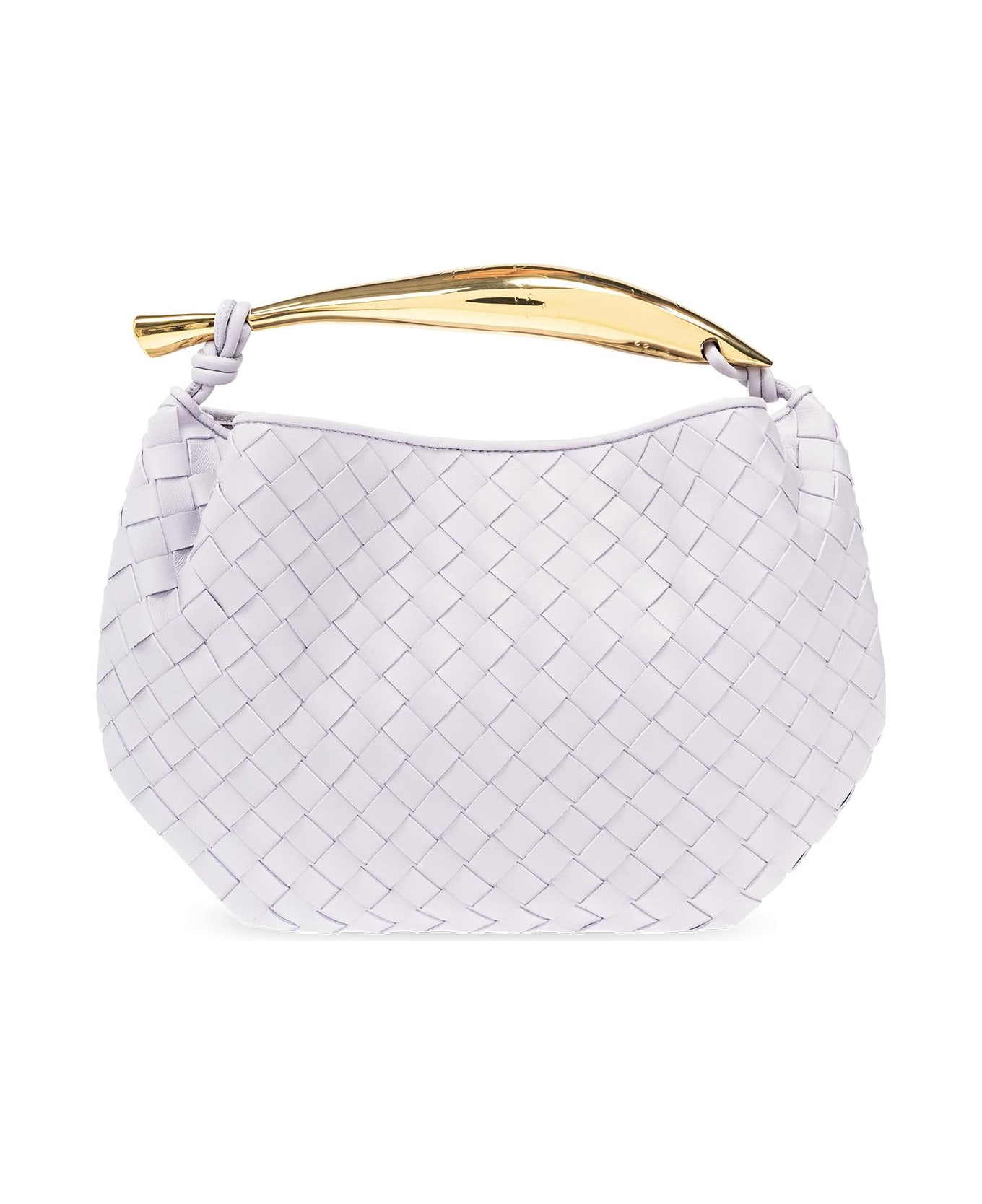 Light purple 'Sardine Small' handbag from Bottega Veneta. Crafted from lamb leather with the brand's signature Intrecciato weave, this model is complete with a magnetic snap closure, decorative engraved brass handle in gold-tone and one internal compartme