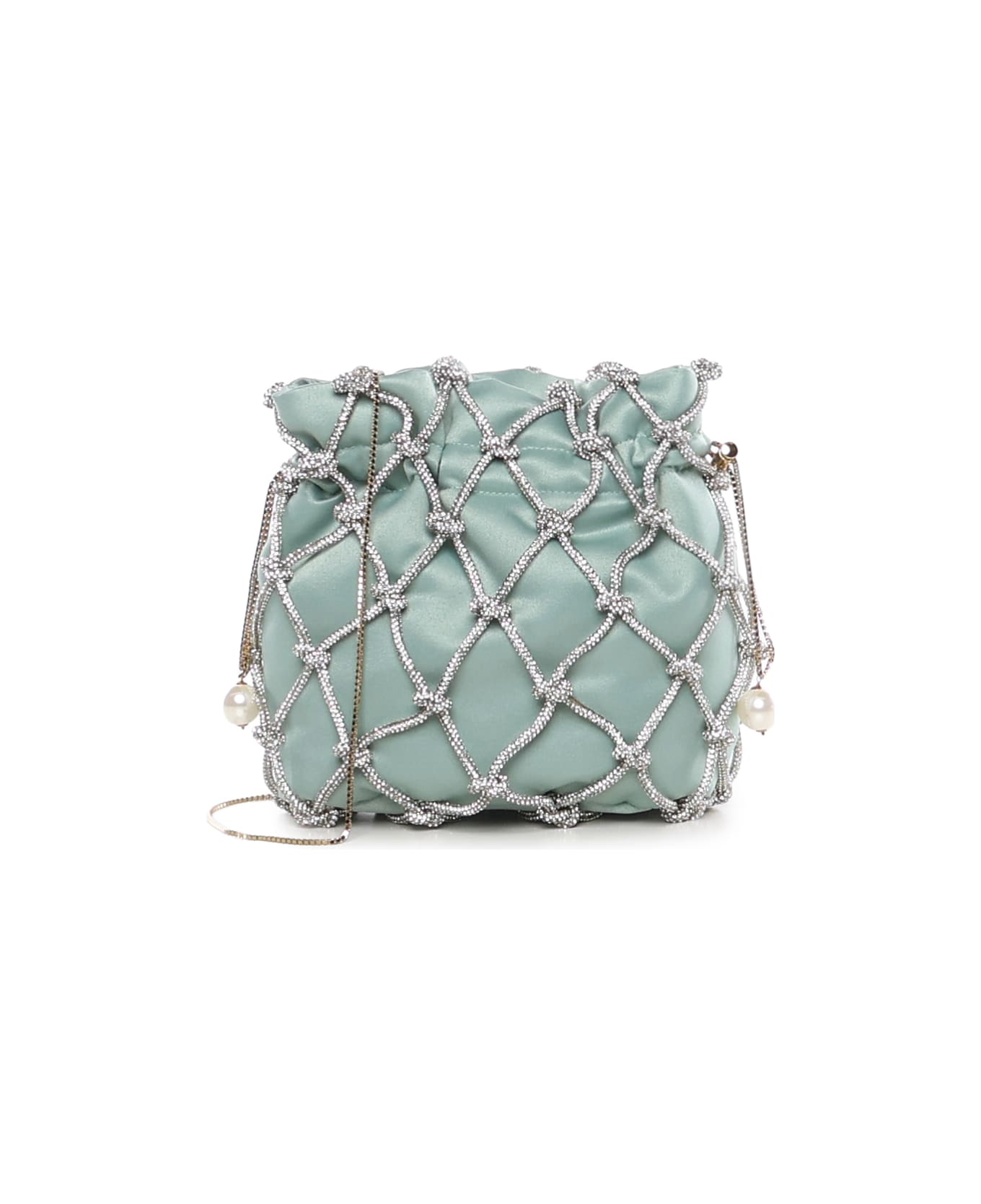 -Made of brass and hotfix -Brass chain shoulder strap -Satin lining -Dimensions: 18 x 18 x 8 cm -Made in Italy -Color: Crystal Mint