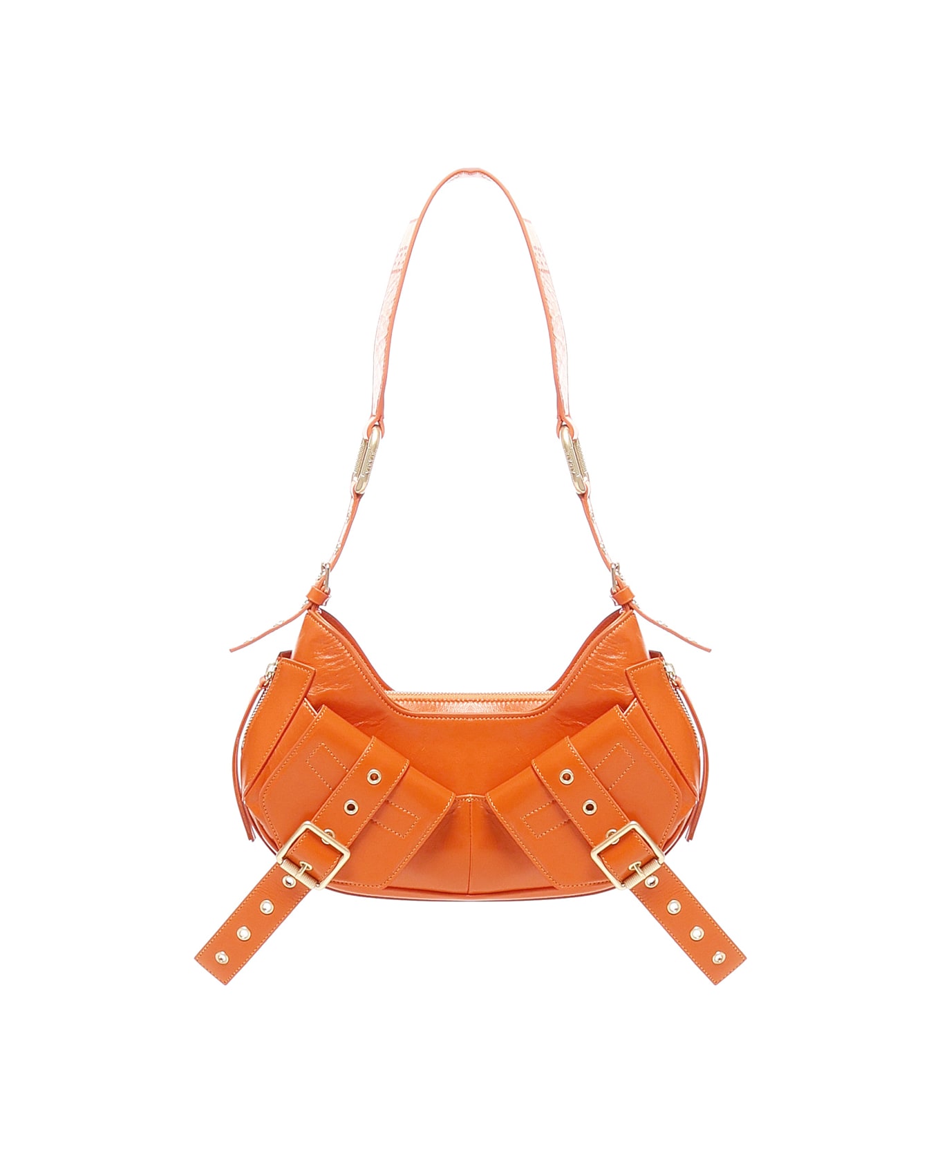 -Shoulder bag with adjustable shoulder strap -Dynamic and genderless silhouette -Zip closure -Detail straps on the front -Dimensions: 18x30x9. 5cm -Made in Italy -Colour: Orange