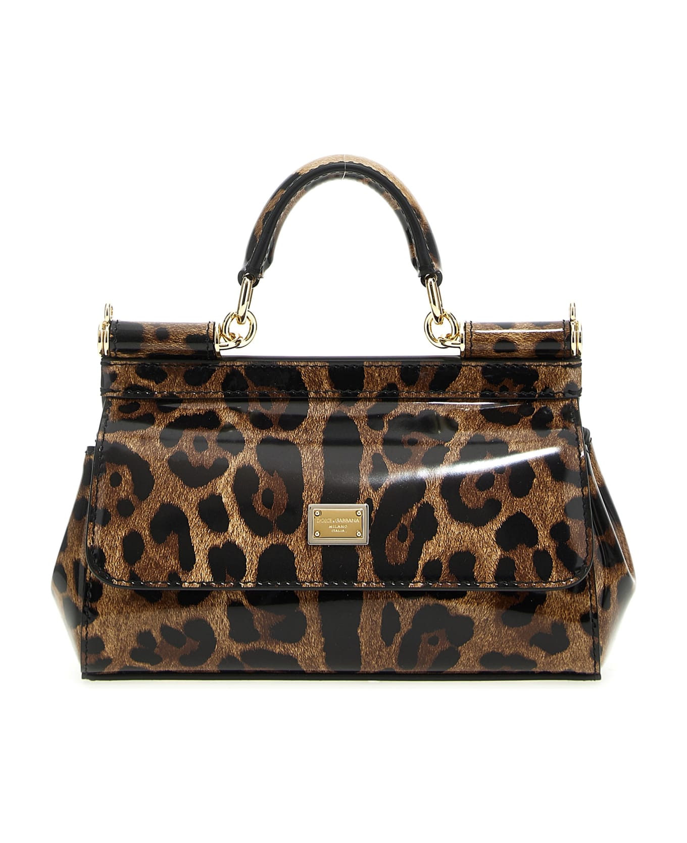 Sicily' small handbag in a leopardo print shiny calf leather with logo leopard metal galvanized metal tag, front flap with concealed double magnet closure, top handle, an adjustable and removable shoulder strap in shiny Leopardo print calf leather, leather lining. Composition: