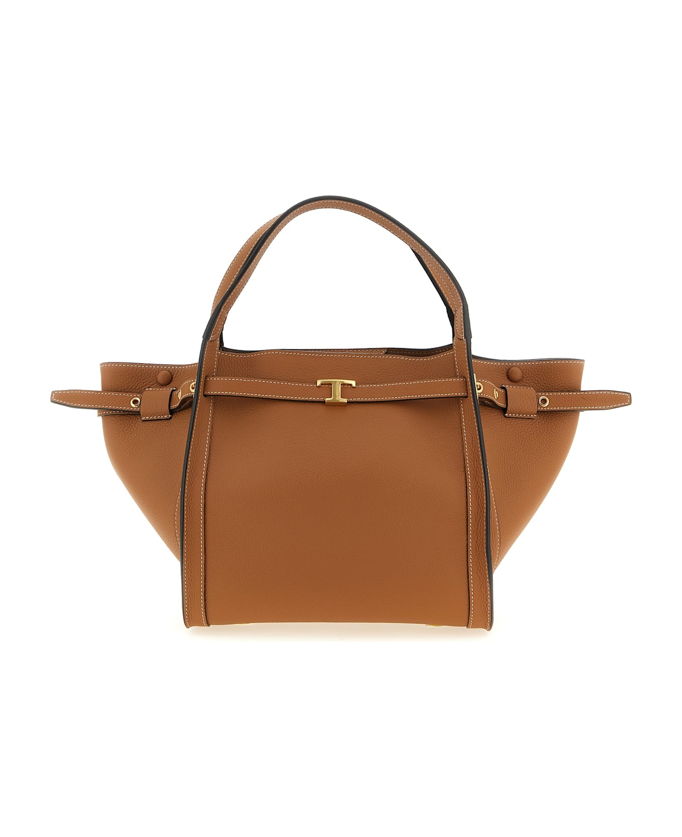 Small 'Tim' hammered calf leather shopping bag, adjustable gussets with snap buttons and belt with front metal 'T Timeless' buckle, double fixed handle, inner hook closure, rigid base with metal feet, adjustable and removable shoulder strap.