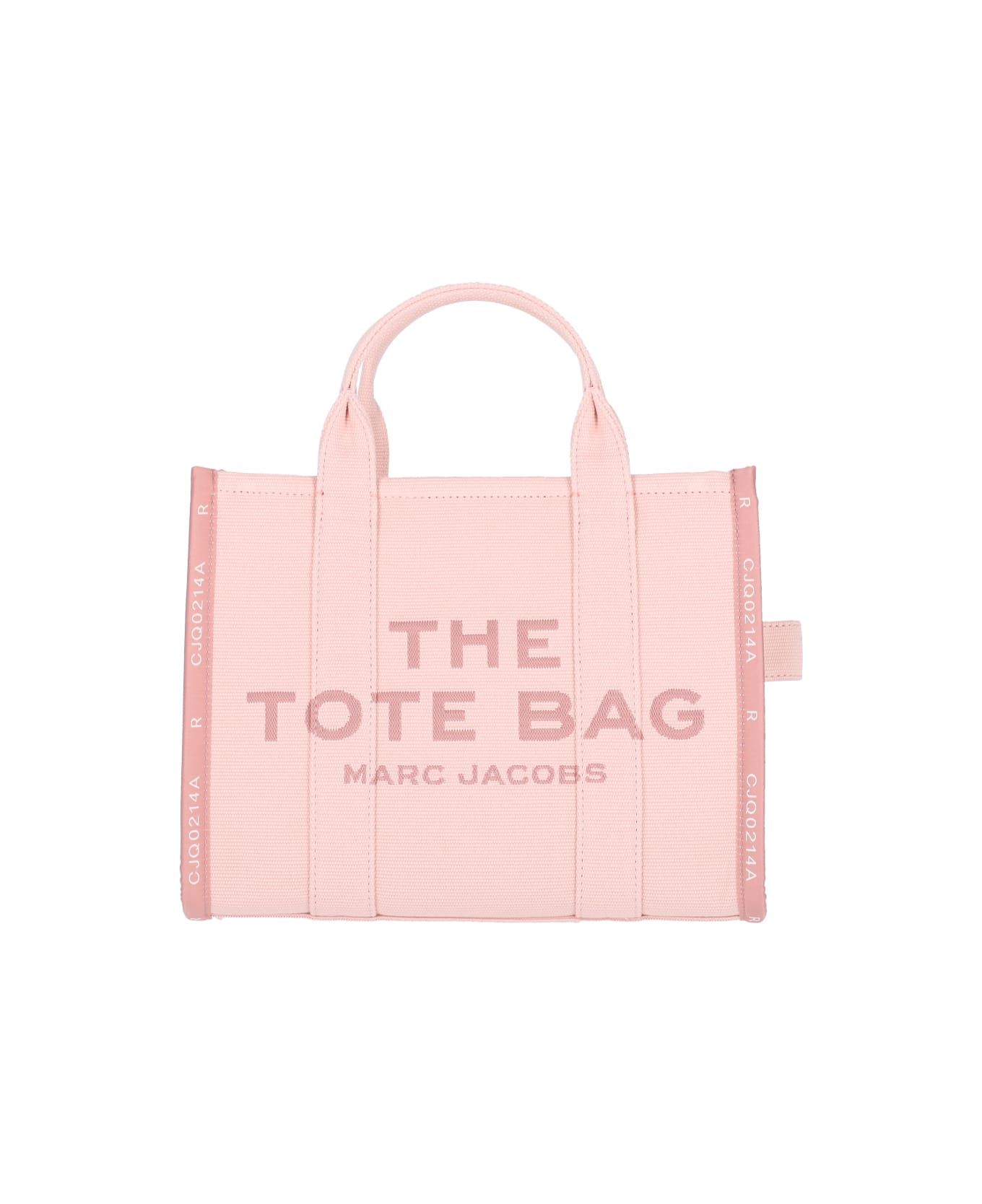 Marc Jacobs The Jacquard Medium Tote Bag in pink cotton blend with removable adjustable shoulder strap, two top handles, top zip closure, front logo intarsia, contrasting side bands, side handle, back logo patch, two inner zip pockets, two inner flat pockets, and a main inner compartment.