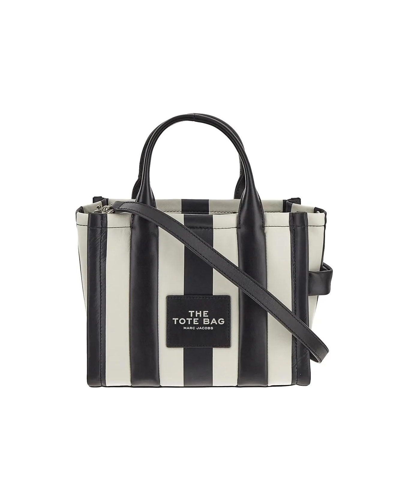 Marc Jacobs small tote bag in black and white striped leather with patched leather branded tag on the front, top handles, side strap, adjustable and detachable black leather shoulder strap, top zip closure, an inner zip pocket, an open pocket and silver-toned metal hardware.