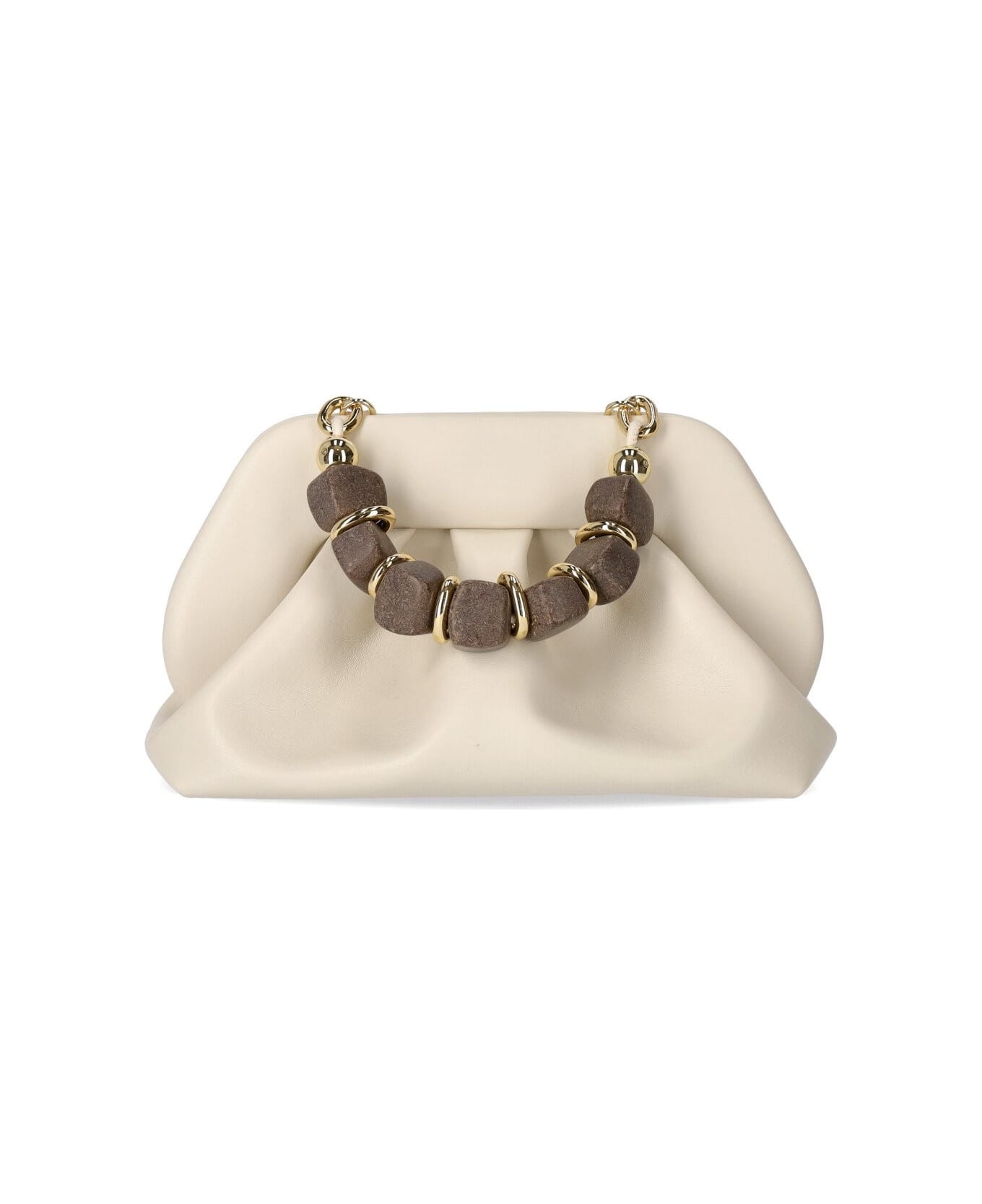 Tia handbag by Themoiré made of ivory-colored vegan leather, featuring golden metal details and handle made with wood-effect pearls and recyclable aluminum rings. Lined interior, magnetic closure and adjustable and removable shoulder strap. Measures 30x24. 5x10 cm. Composition: 100% vegan PU. Lining: 100% recycled material.