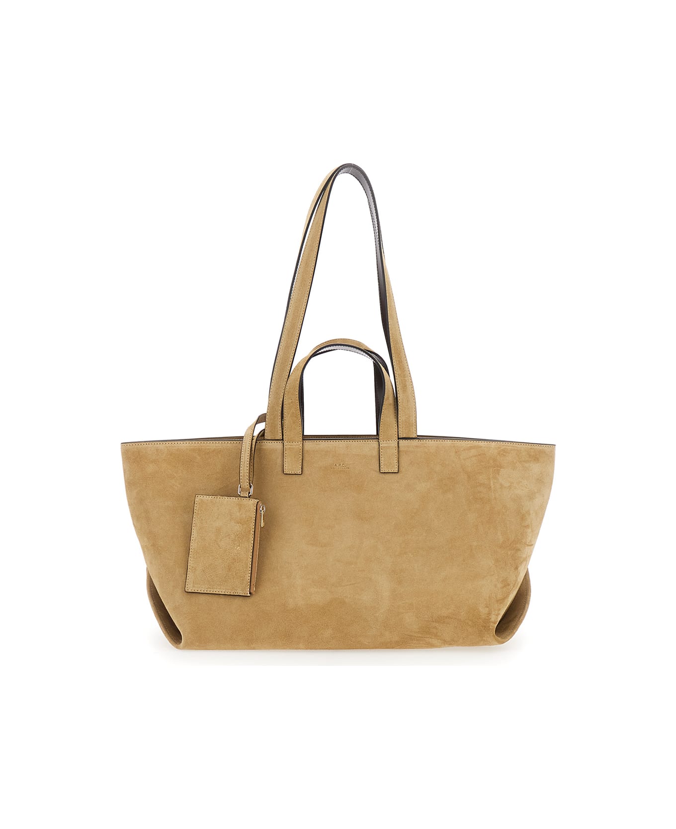 Shopper in Suede. Beige. The bag features four handles: two long and two short, allowing for different carrying options. On the front, there is a logo lettering. Inside, there is a single compartment with an internal wallet. In suede. Women. Dimensions: 53x23x19. 5 cm.