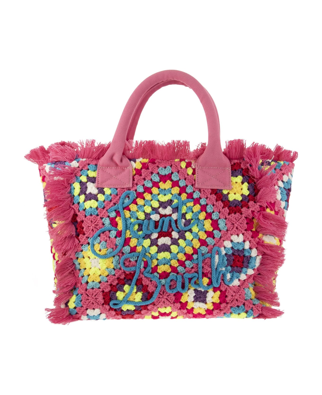 Handmade crochet vanity bag with fringes along the edges and embellished with an embroidered logo in a contrasting colour on the front. Comfortable canvas handles finish off this bag to carry with you at all times. - One zipped inside pocket - Multicoloured pattern - Zip closure - Front logo DESIGNER ID: VANI010 05268D Composition: 95% Cotton, 5% Polyester 100% Cotton